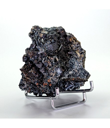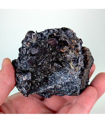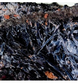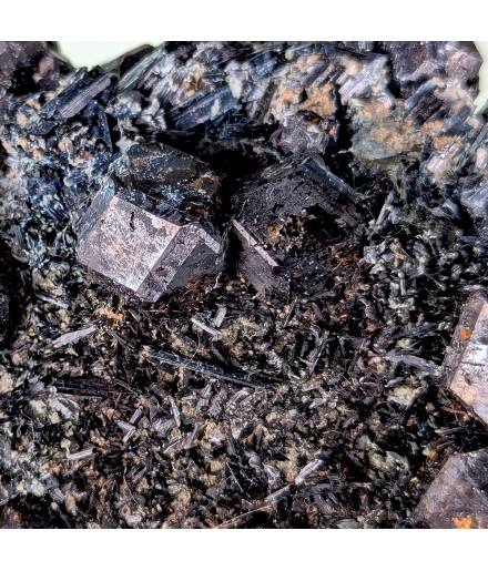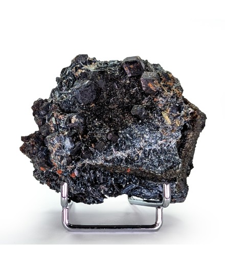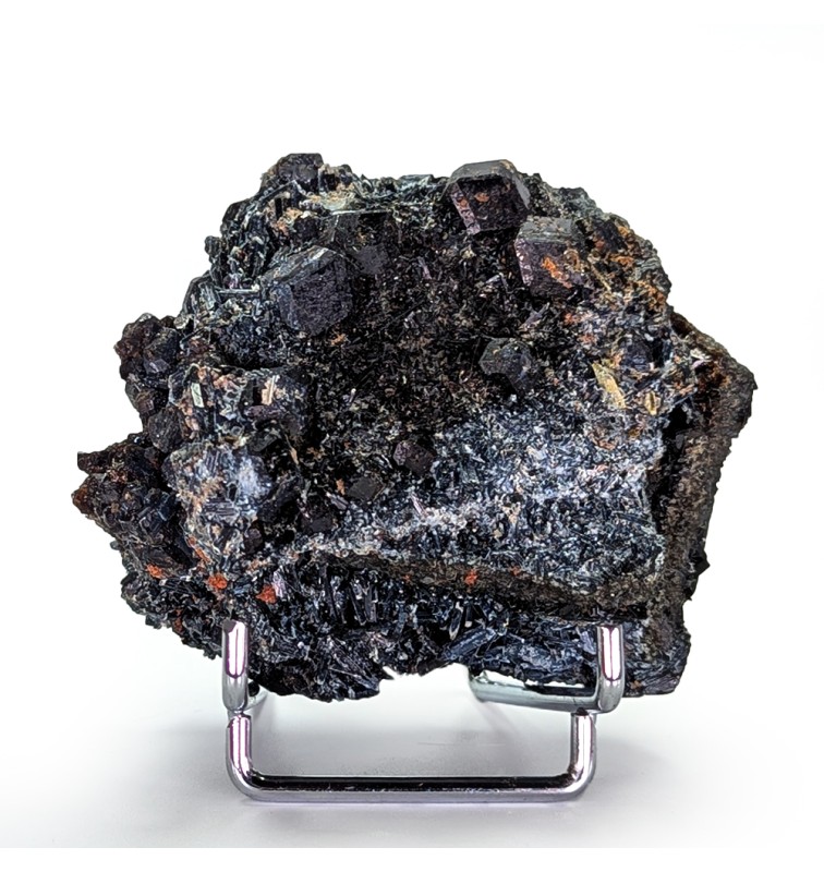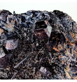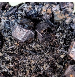 Pour les amateurs de minéraux sombres ! Cristaux de grenat var. melanite sur des cristaux de pargasite. Pièce bien cristallisée.