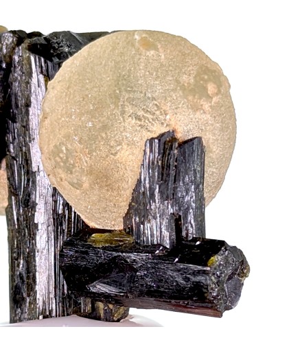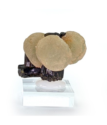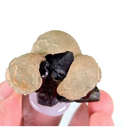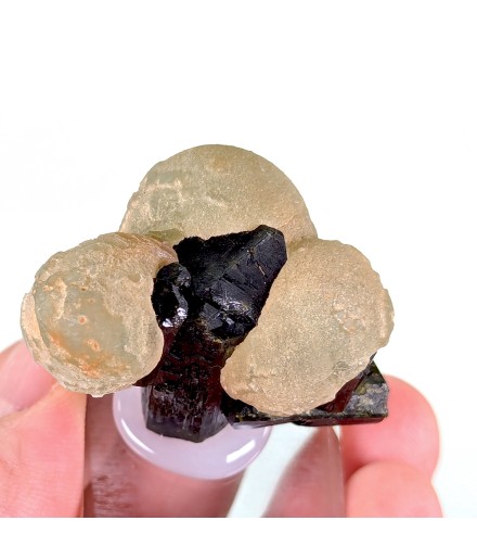Epidote portant sur ses cristaux trois boules de prehnite vert pomme.