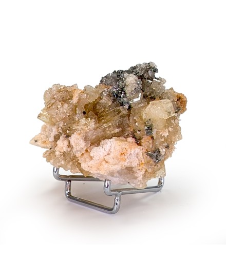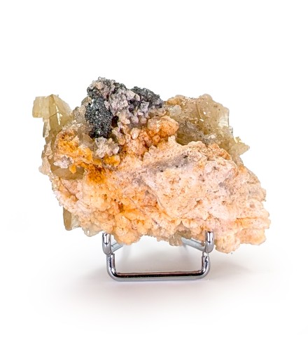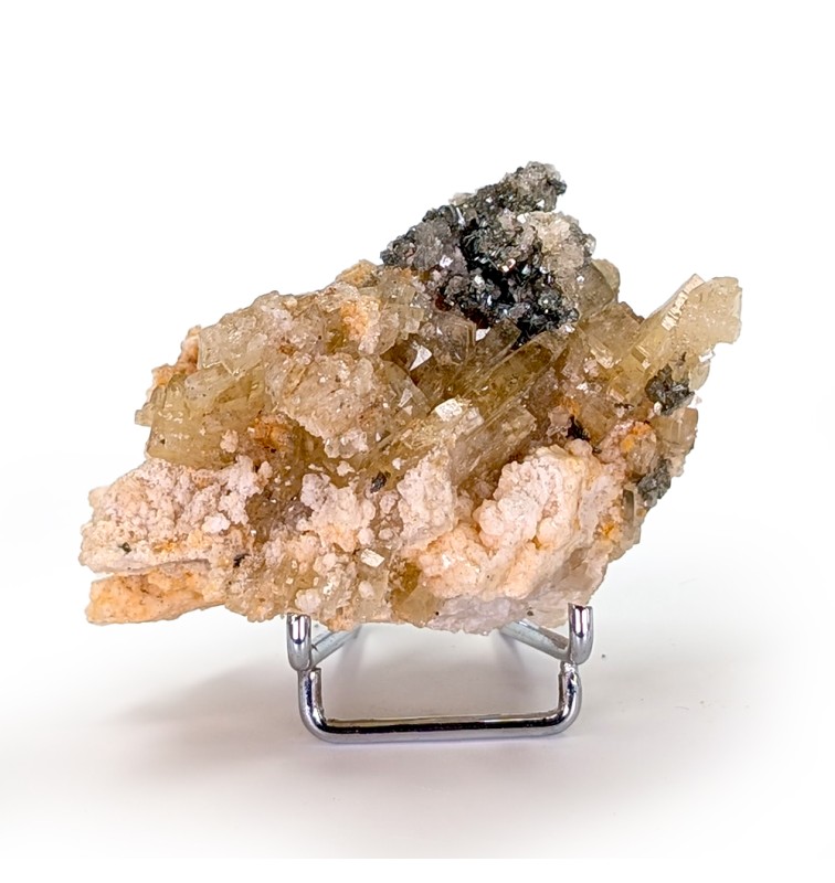 Échantillon agréable de baryte jaune et brillante accompagnée de pyrite sur une gangue de baryte brute.