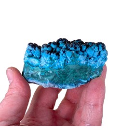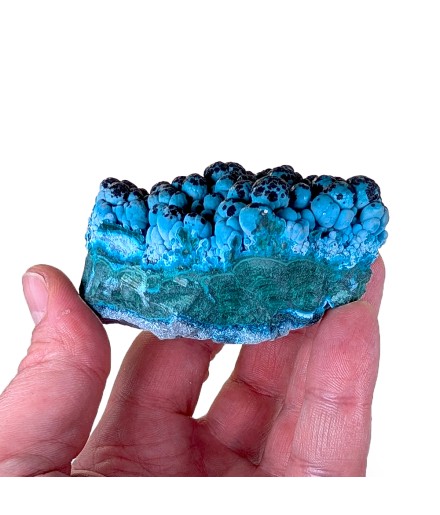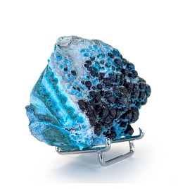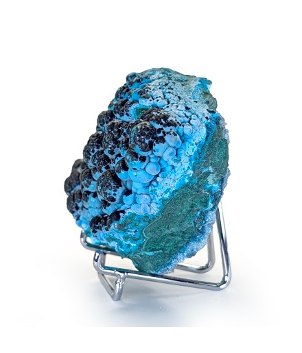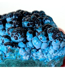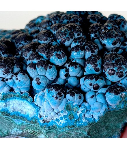Une pièce agréable à regarder avec ses couleurs vives, présentant de la chrysocolle globulaire sur malachite, partiellement recouverte d'un enduit noir d'hétérogénite.