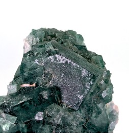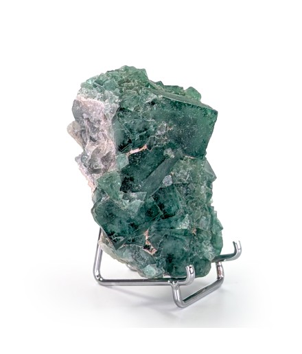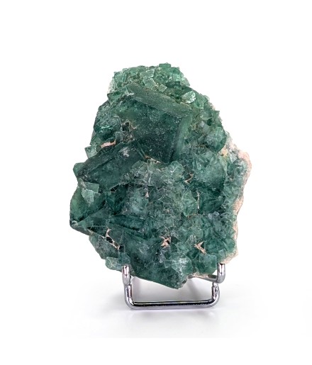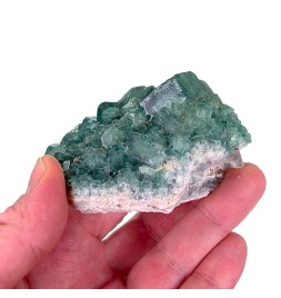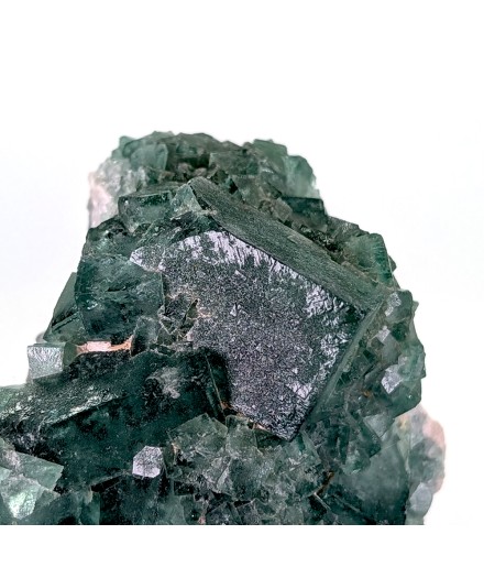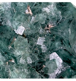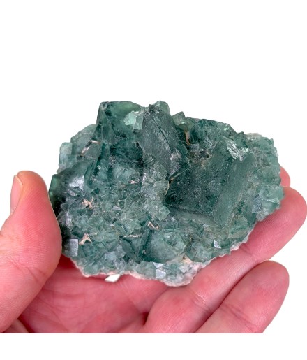 Fluorite verte sur gangue avec quelques cristaux centimétriques reposant sur un tapis de cristaux plus petits. Les cristaux verts deviennent bleutés à la lumière du soleil.