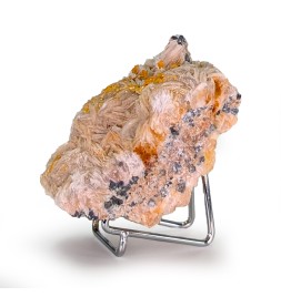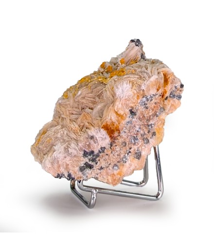 Ancienne pièce présentant des cristaux de wulfénite orange, une cristallisation de baryte crêtée sur deux faces, et de la galène brute dans la gangue.