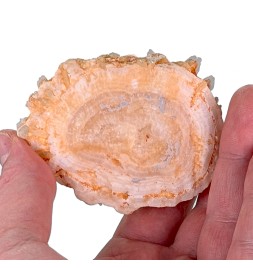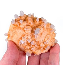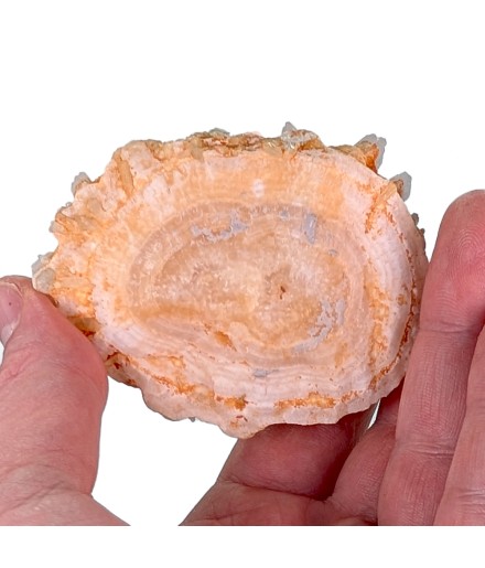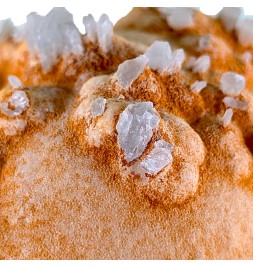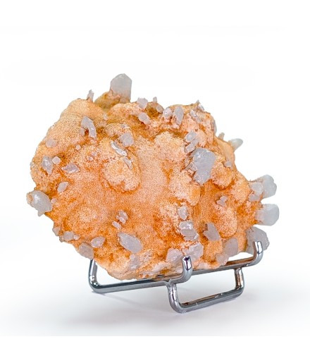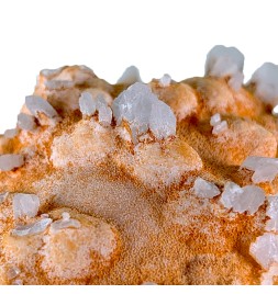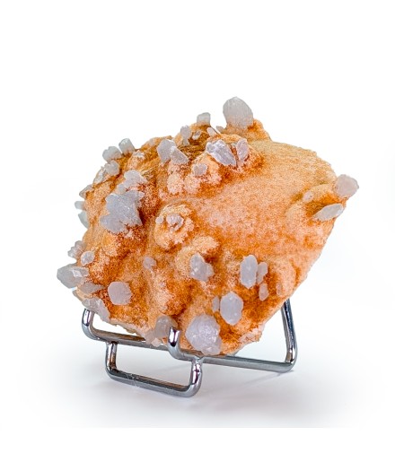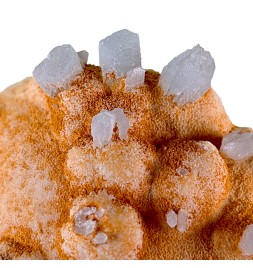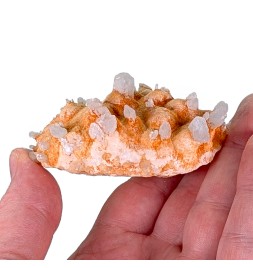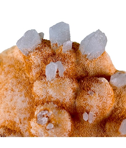 Une pièce étonnante avec, sur une gangue de calcite teintée par des oxydes, des cristaux épars de célestine bleue.