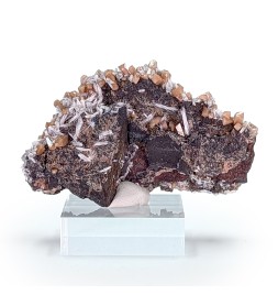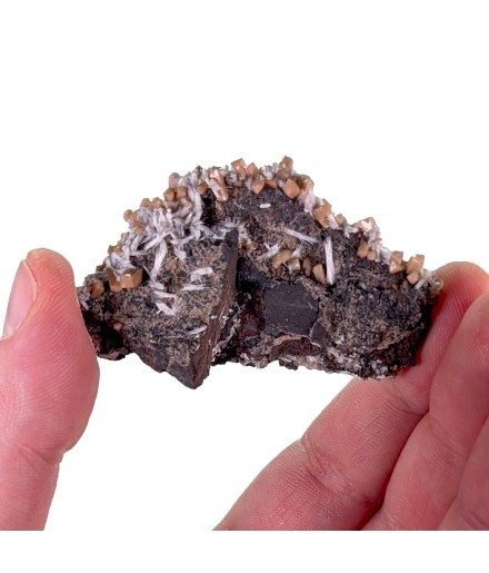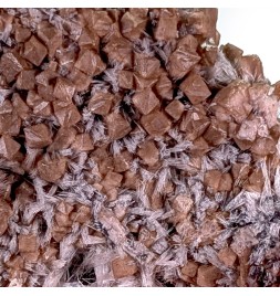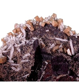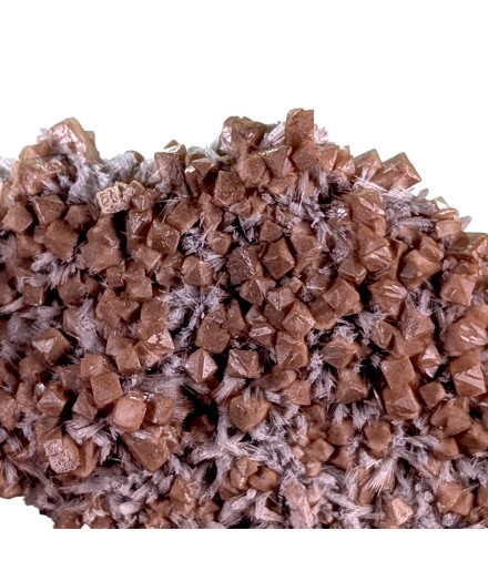 Rare échantillon de poldervaartite avec des cristaux bruns mêlés à des fibres blanches de bultfonteinite.