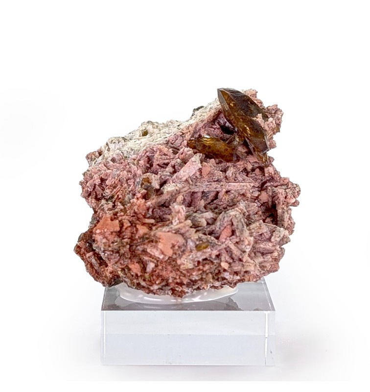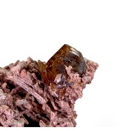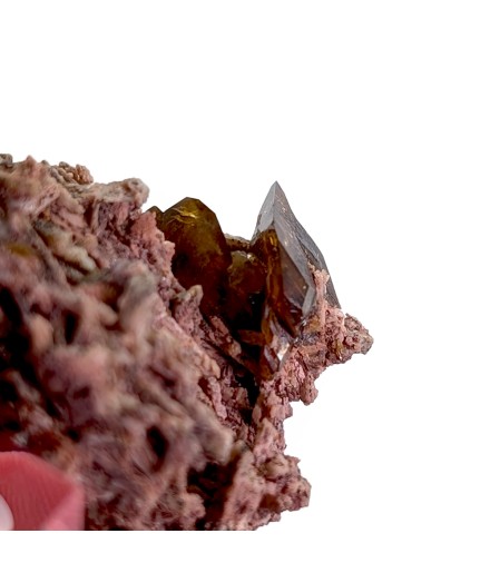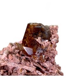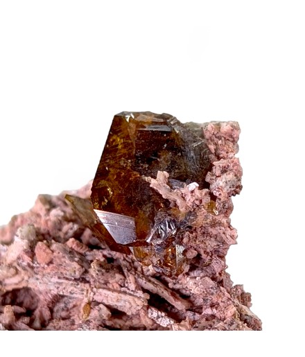 Cristaux de titanite brun jaune, bien définis, sur une gangue de feldspath altéré et teinté par des oxydes.