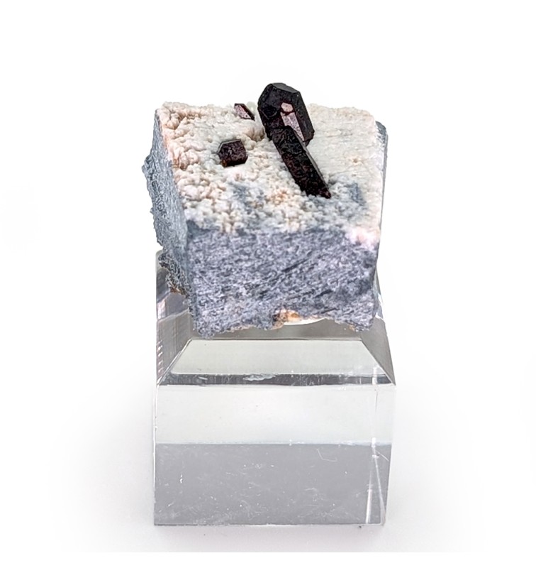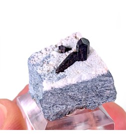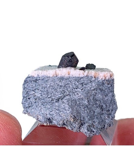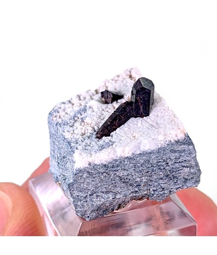 Cristaux de neptunite sur natrolite, dont le plus gros est terminé.