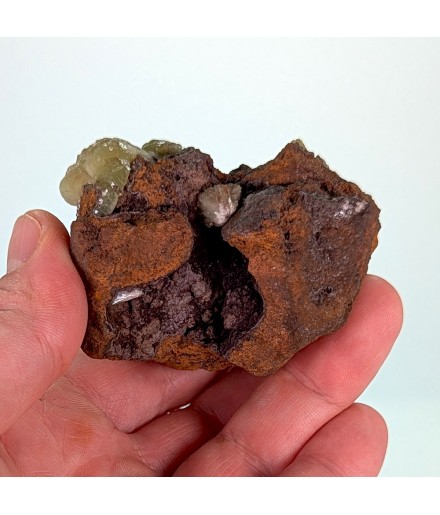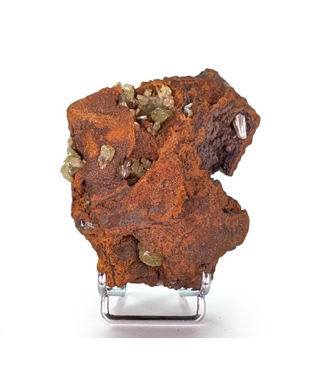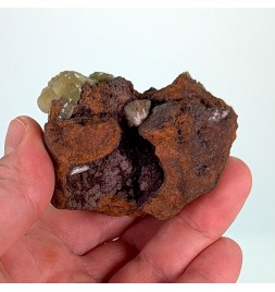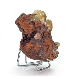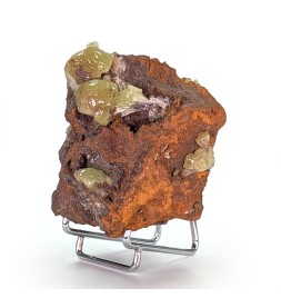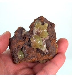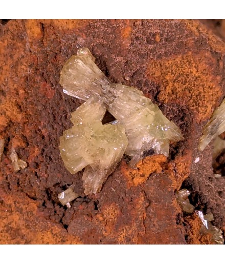 Adamite jaune verte sur une gangue de limonite, avec des zones de cristallisation sur le pourtour de la pièce.