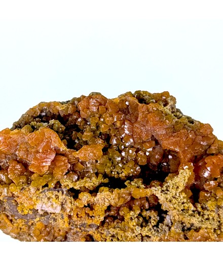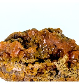 Jolie présentation pour cette adamite, montrant deux cristallisation différentes sur une gangue ocre. La première forme un éventail et la seconde présente des cristaux plus prismatiques.