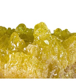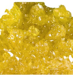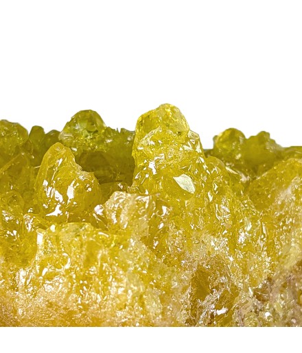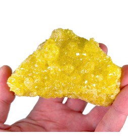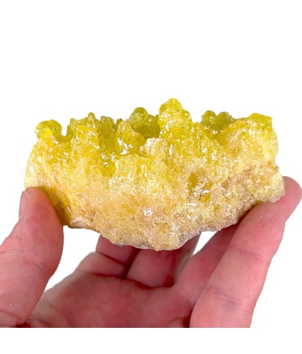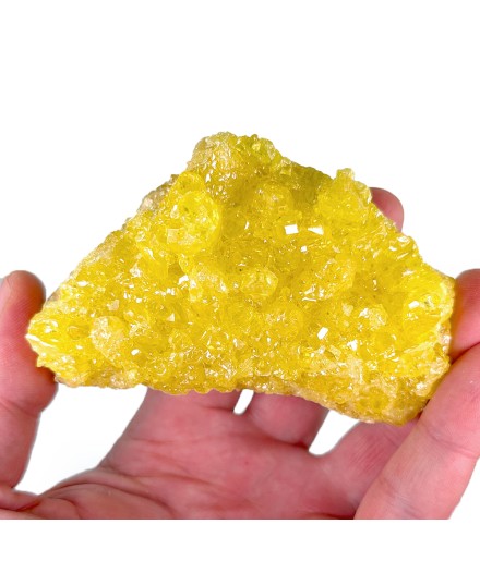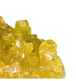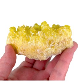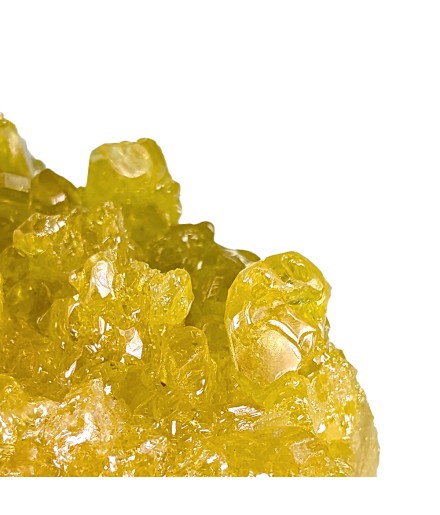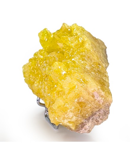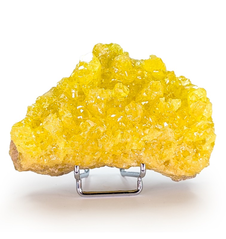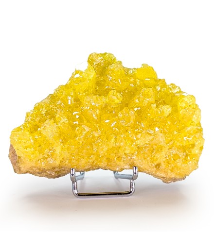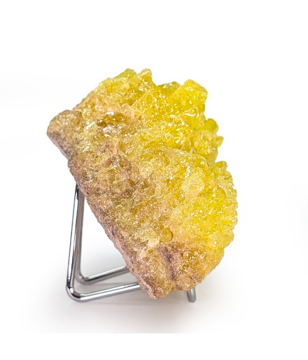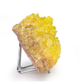 Soufre natif bolivien cristallisé avec une très belle couleur qui met du "peps" dans une vitrine.