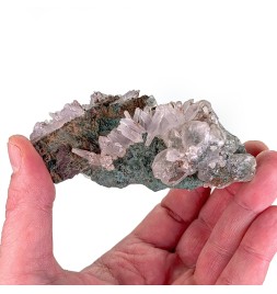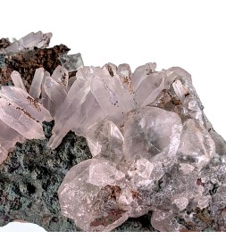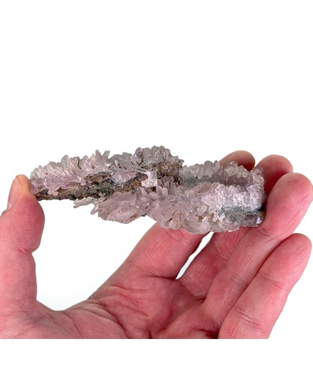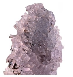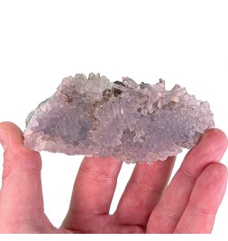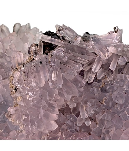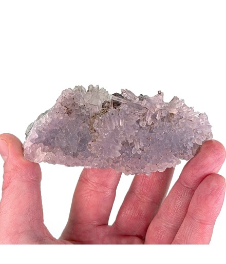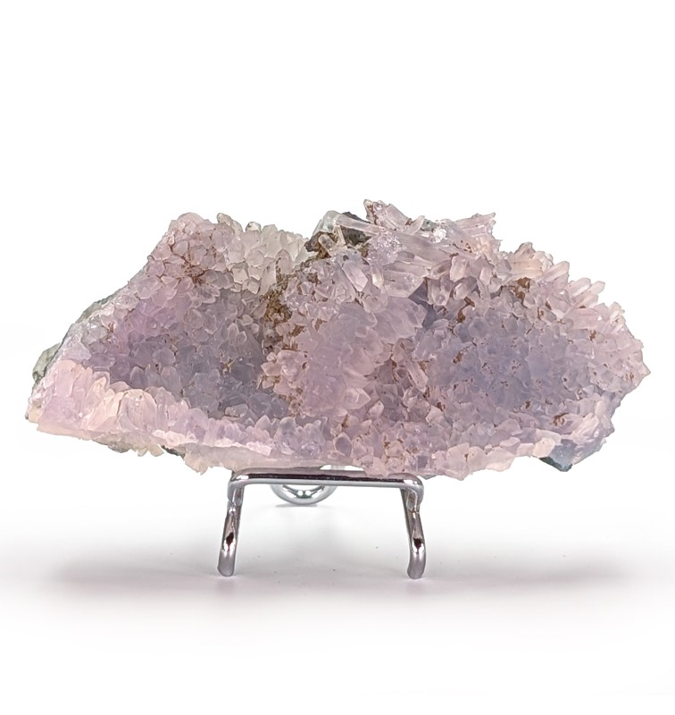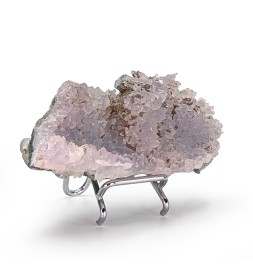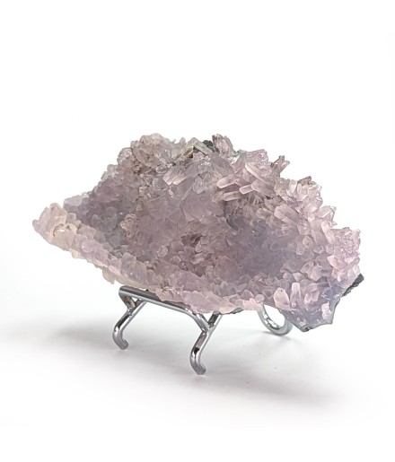 Échantillon d'améthyste, avec des cristaux fins, prismatiques, de couleur lavande, accompagnée par des cristaux de calcite au dos de la pièce.