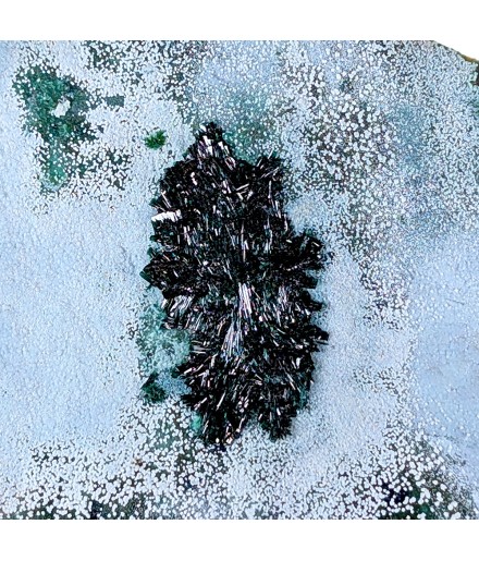 Jolie présentation pour cette atacamite formant un ovale vert brillant sur un fond bleu de chrysocolle.