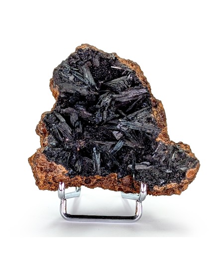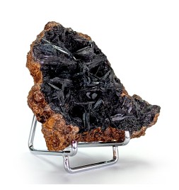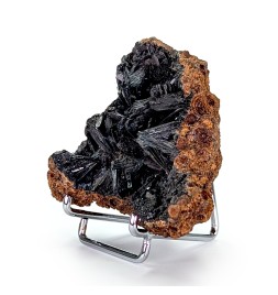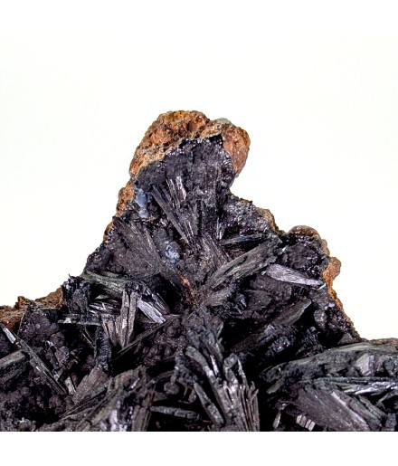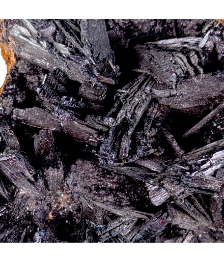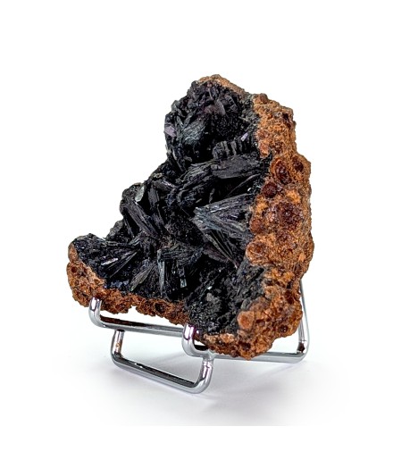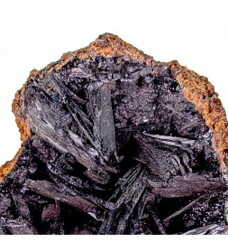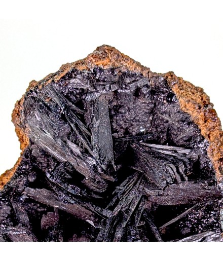 Cristaux de vivianite noire associée à de la goethite mamelonnée, sur une gangue ferreuse.