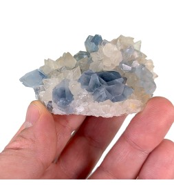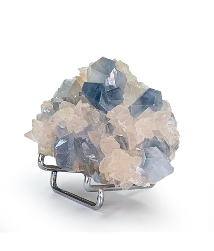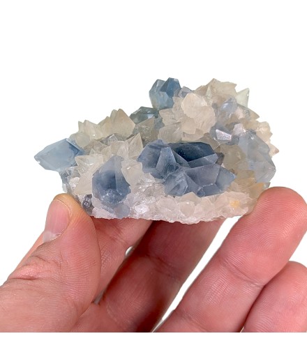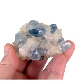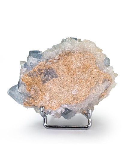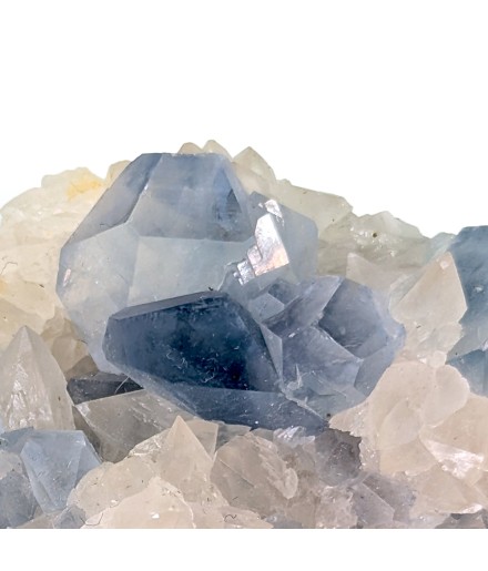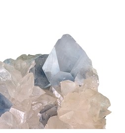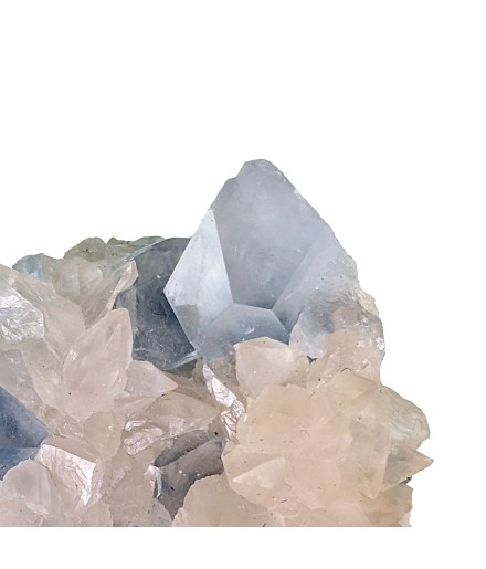 Voici une pièce délicate, avec des cristaux de célestine bleutée associés à de la calcite dent de chien.
