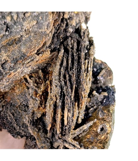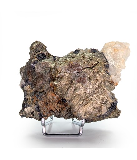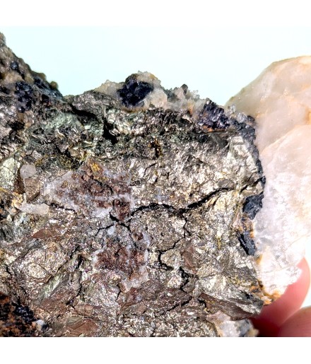 Ancien échantillon de pyrrhotite associée avec du quartz et un peu de pyrite à l'arrière.