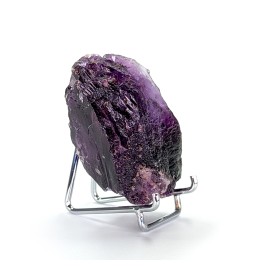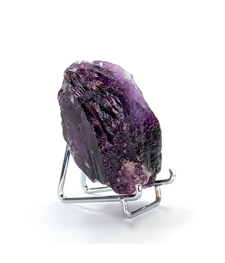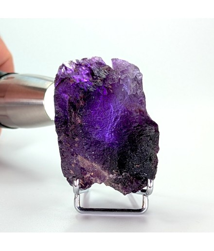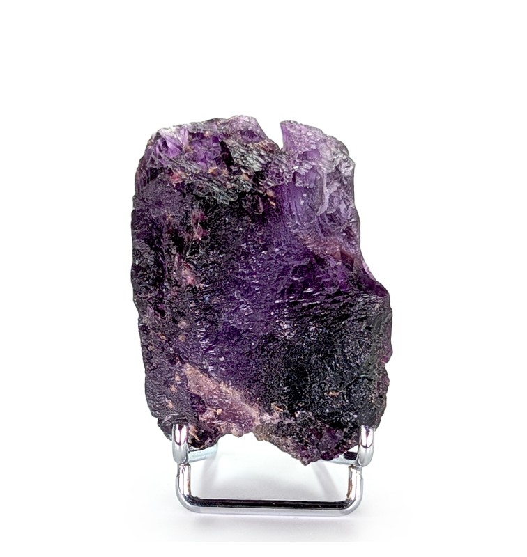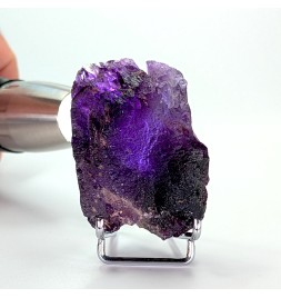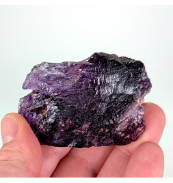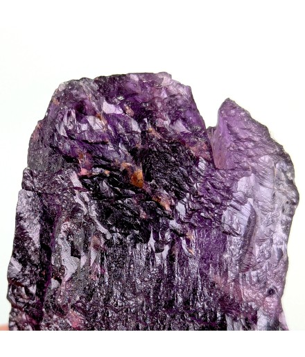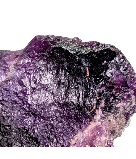 Échantillon flottant de fluorite violette, avec un aspect fondu typique de ce gisement ainsi qu'un coté plat (clivage).