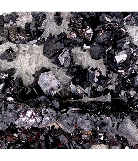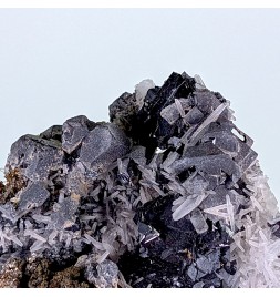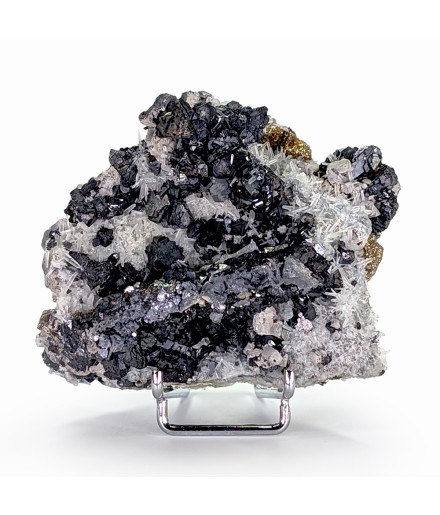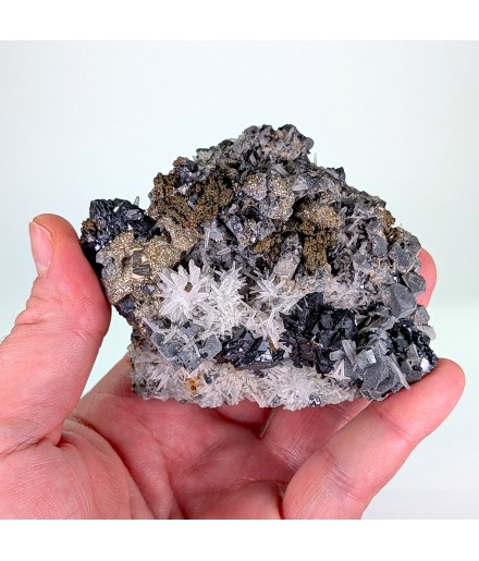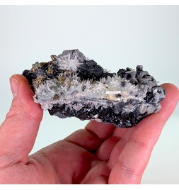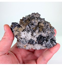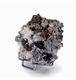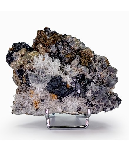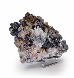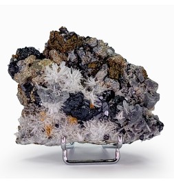 Bon échantillon, bien cristallisé sur les deux faces, avec une riche association de gerbes de quartz, de cristaux de galène,de pyrite et de sphalérite.