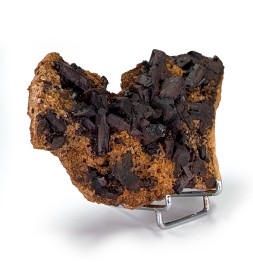 Ancienne plaque portant des cristaux dépassant le centimètre d'ilvaïte, un silicate. Les cristaux, prismatiques et striés, ont une couleur brun rouille .