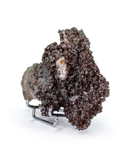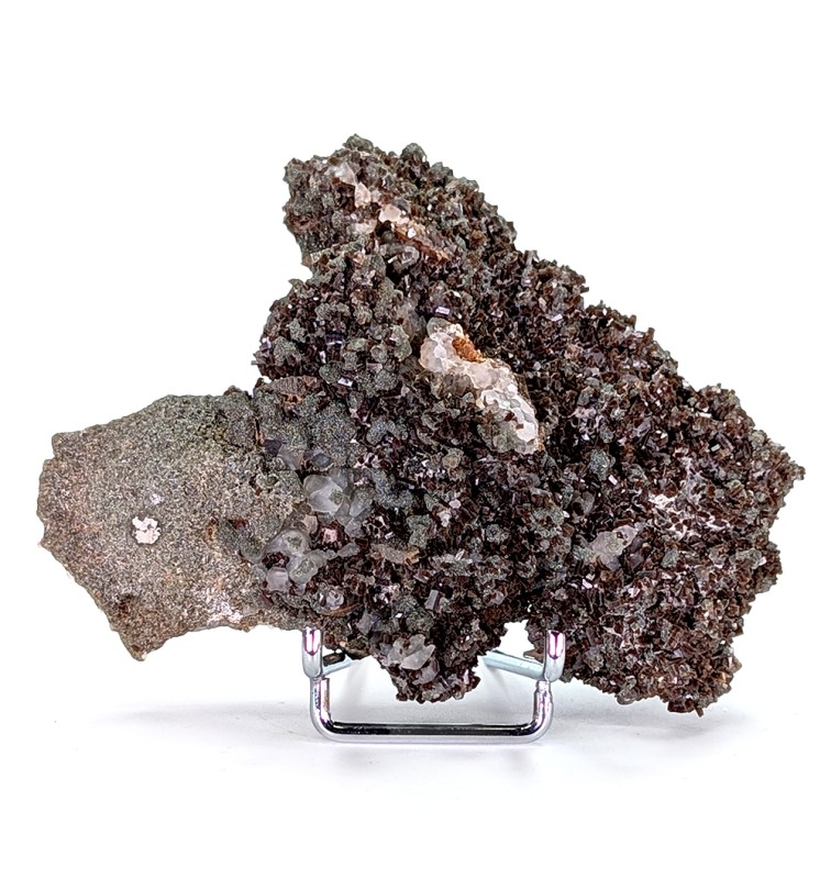 Voici une jolie pièce alpine portant des cristaux d'anatases accompagnés de cristaux bruns d'adulaire, de la calcite ainsi que de la chlorite verte.