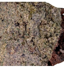 Échantillon de péridotite, principalement constitué d'olivine, prise dans une enclave de basalte (xénolite). Provient d'une ancienne collection, le massif est sous protection maintenant.