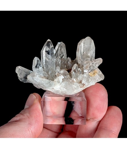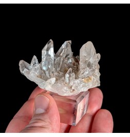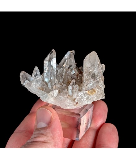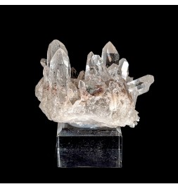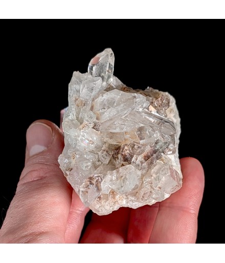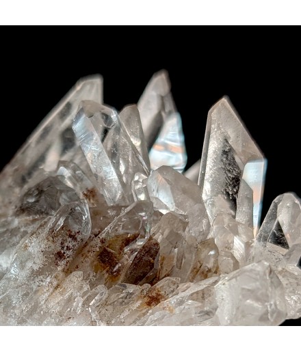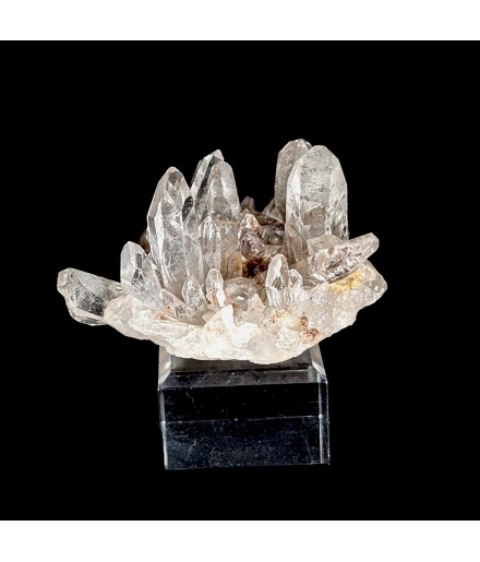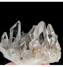 Échantillon de quartz provenant de la mine La Gardette, avec des cristaux limpides contenant quelques oxydes à la base des prismes.