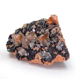 Here is a pretty alpine piece bearing crystals ofanatases accompanied by brown adularia crystals, calcite as well as green chlorite.