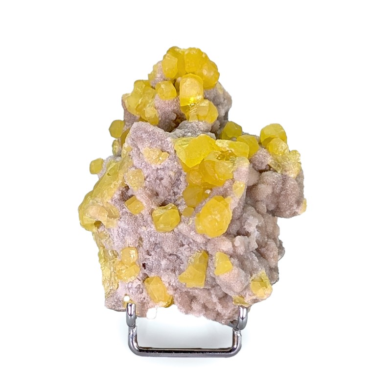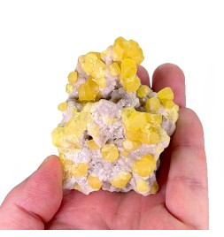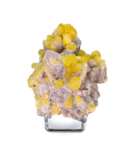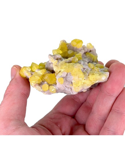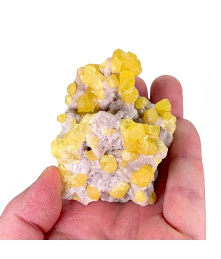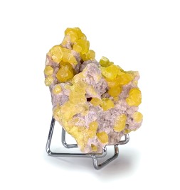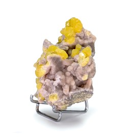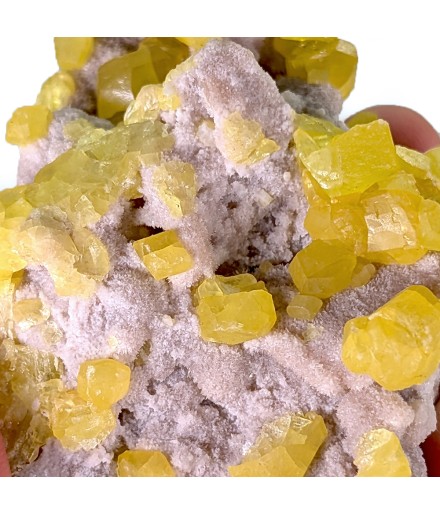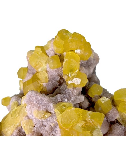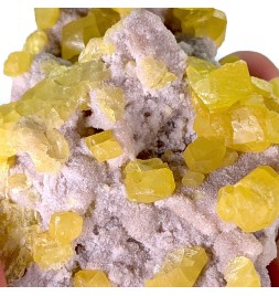 Piece of sulphur crystallized, with many canary yellow crystals on a matrix ofaragonite.
