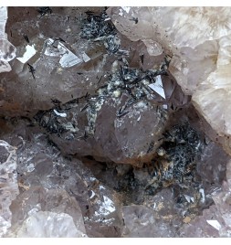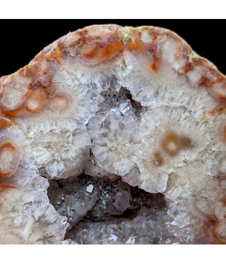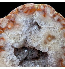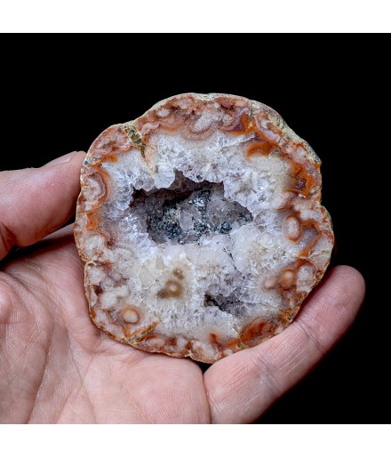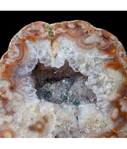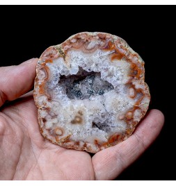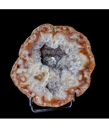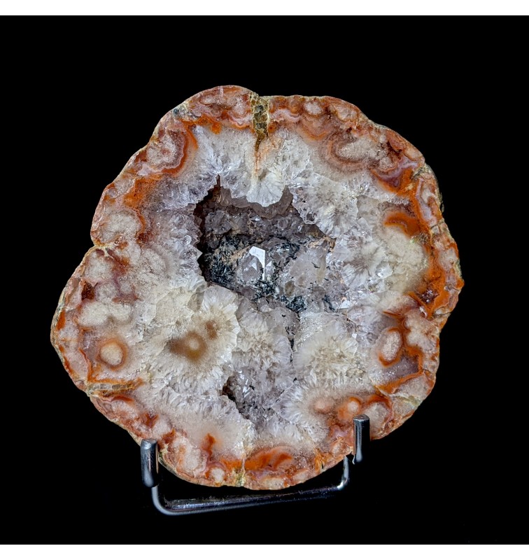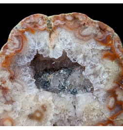 Half geode ofpolished agate with a red periphery and a cavity presenting a crystallization of quartz. This quartz is accompanied by a second metallic mineral, perhaps hematite.
