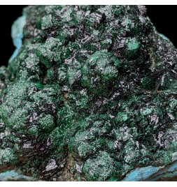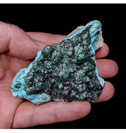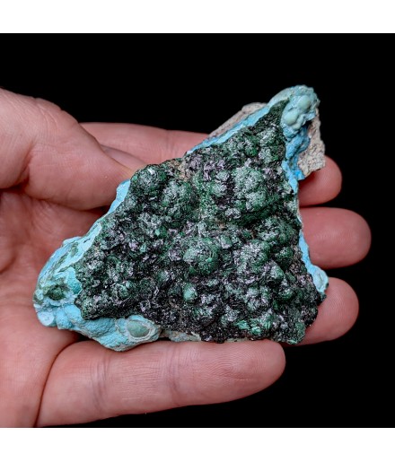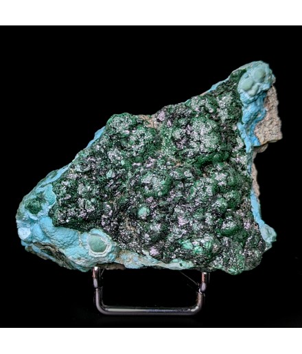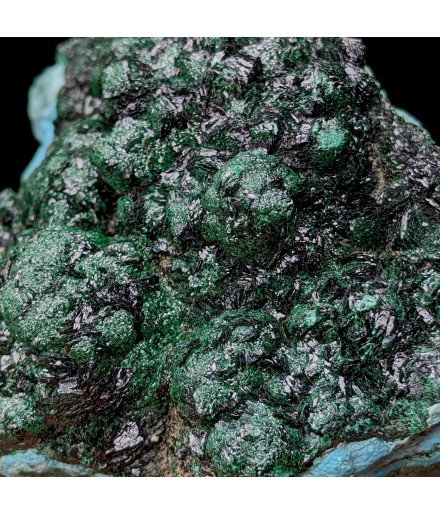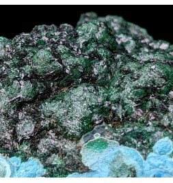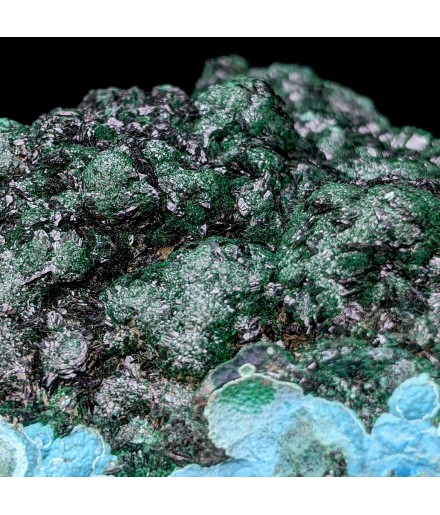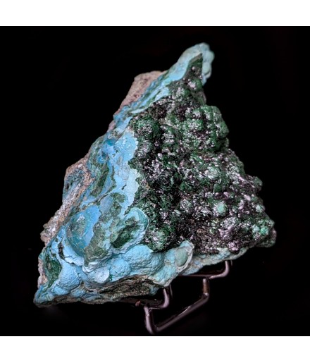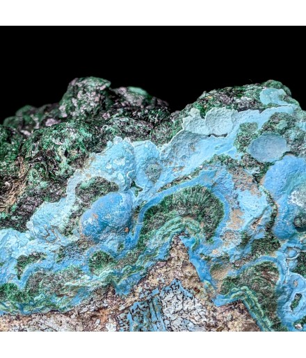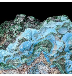 Piece associating on a bed of chrysocolla of the malachite shiny and a partial covering ofheterogenite.