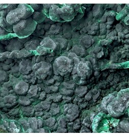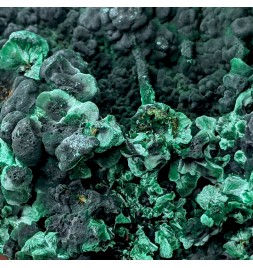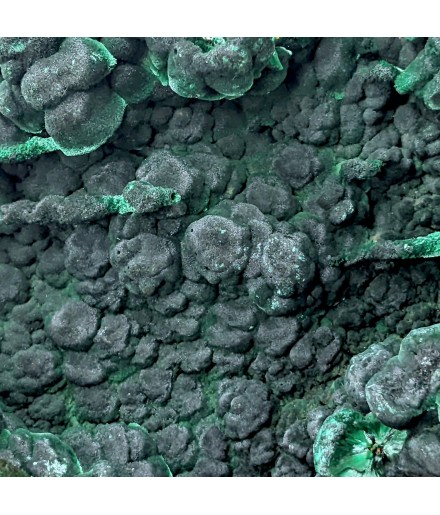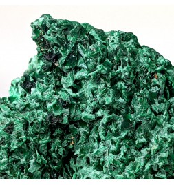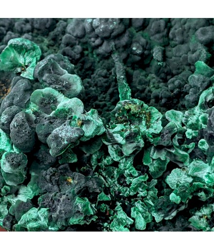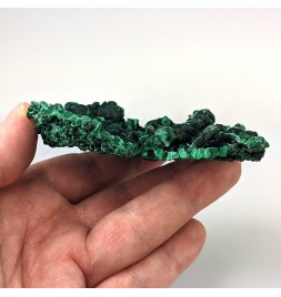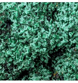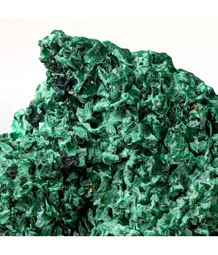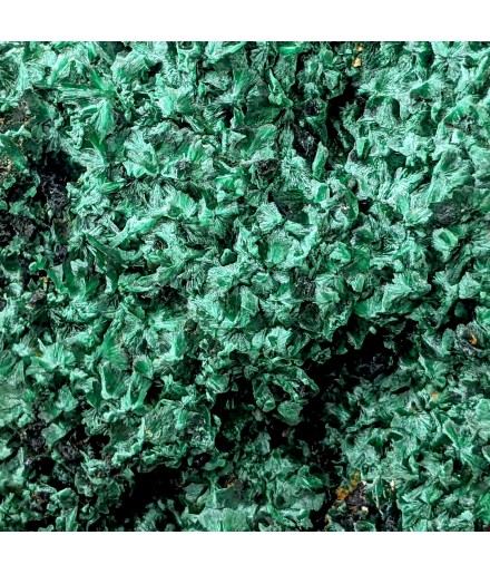 Fine plate of malachite with a dark and silky looking face and a back with shiny fibers forming millimetric rosettes.