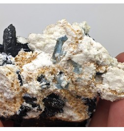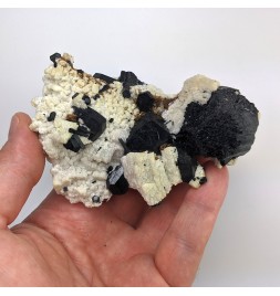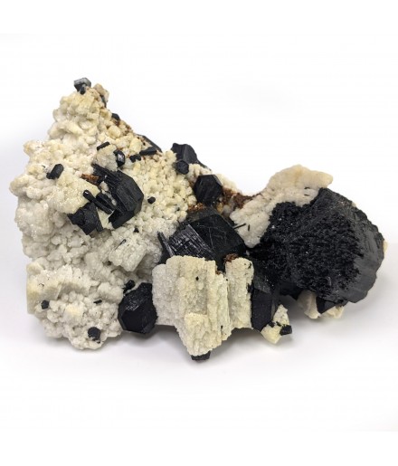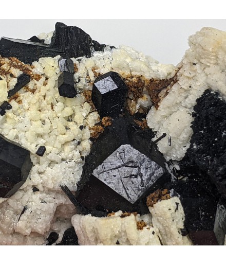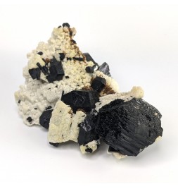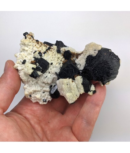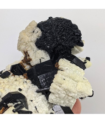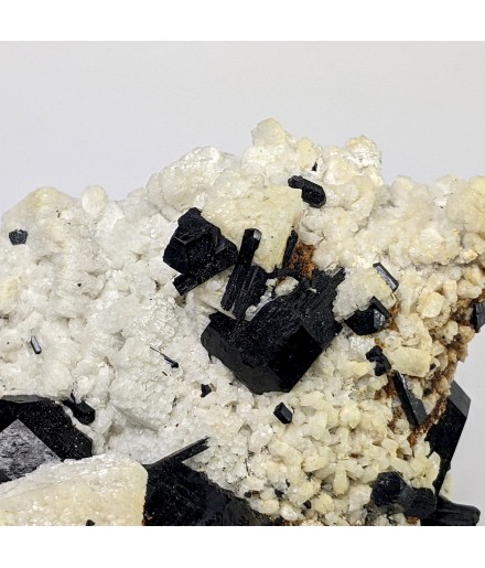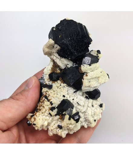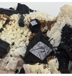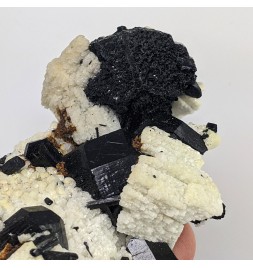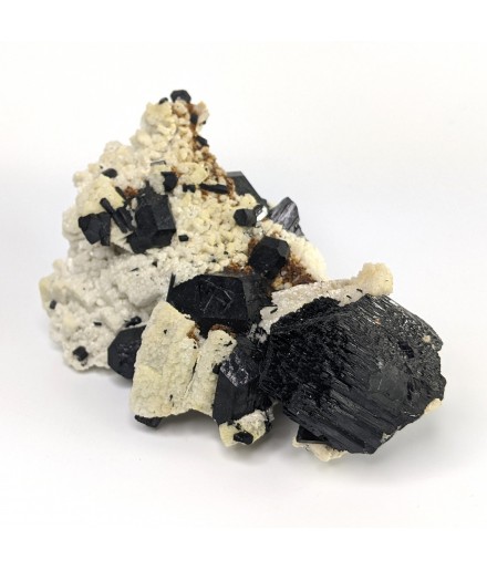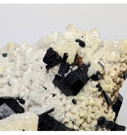 Black tourmaline on feldspar, with a main crystal with a dissolved termination and other crystals on the contrary with bright prisms and finished.