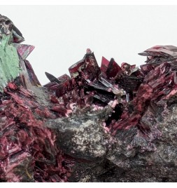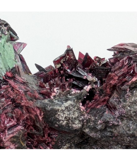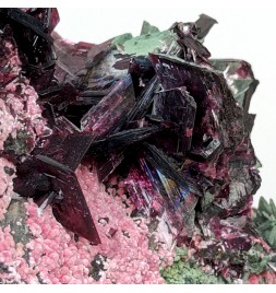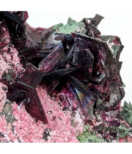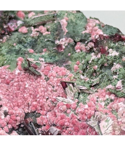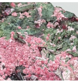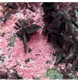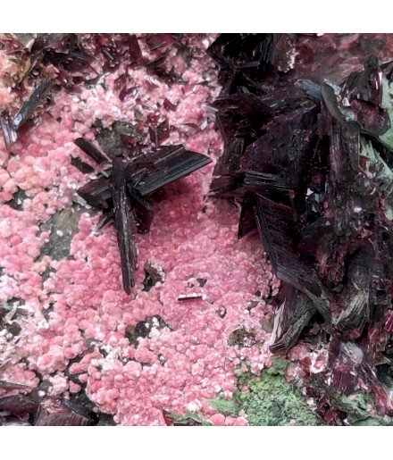 Nice presentation for this piece, with prismatic crystals oferythrite overlooking a carpet of spheres of picropharmacolite pink.