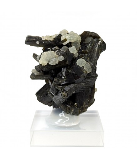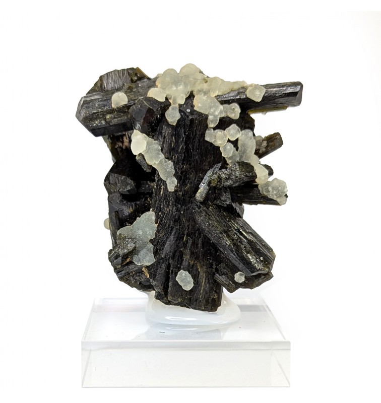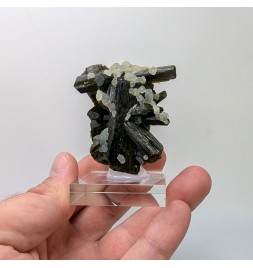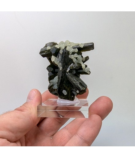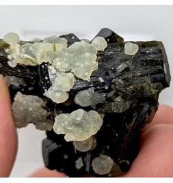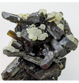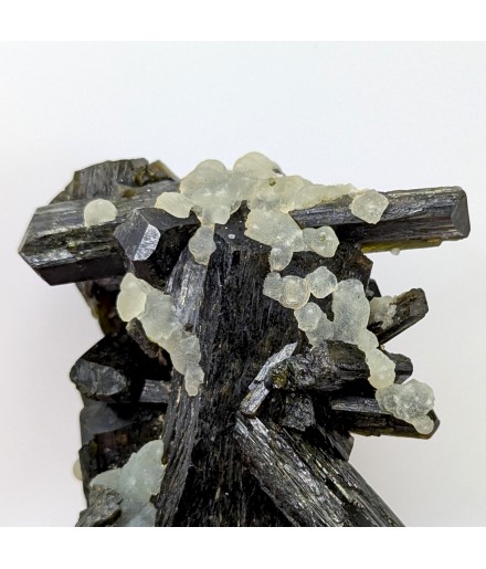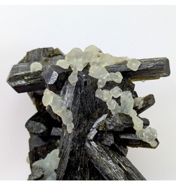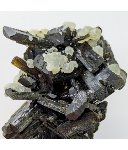 Aesthetic entanglement of finished crystals ofepidote topped by a few balls of prehnite.