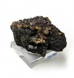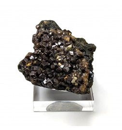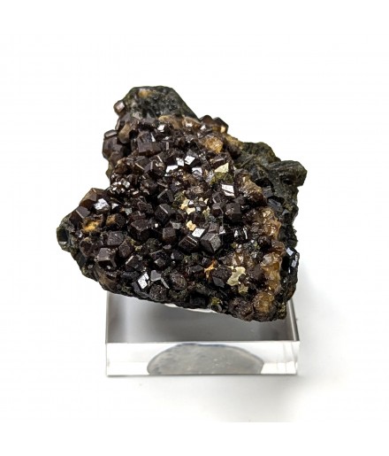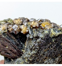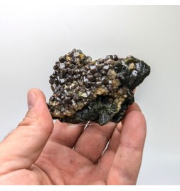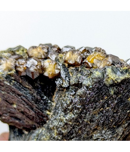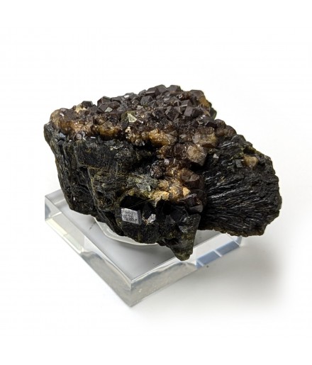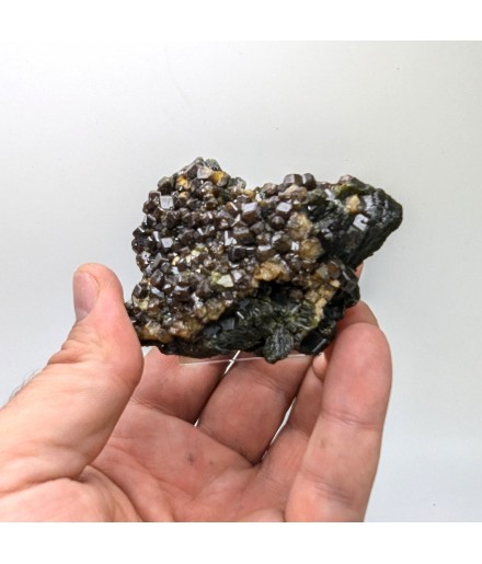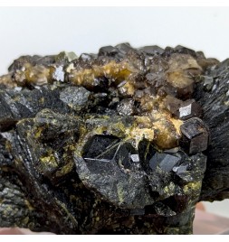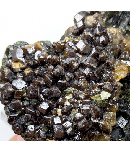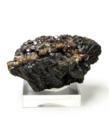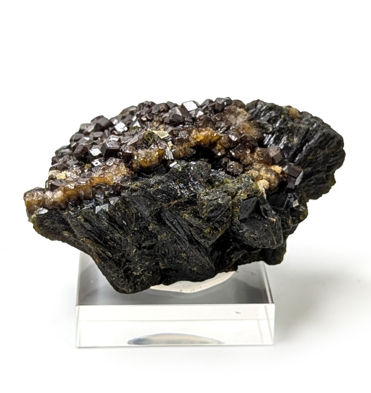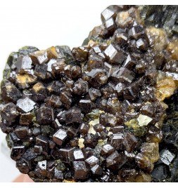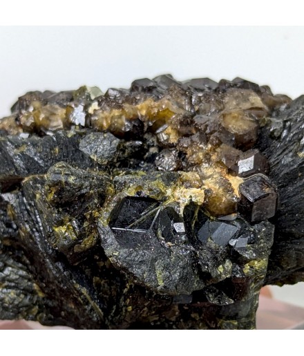 A piece with a rare association, with a crystallization ofepidote dark green covered with numerous andradite garnets.