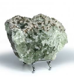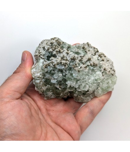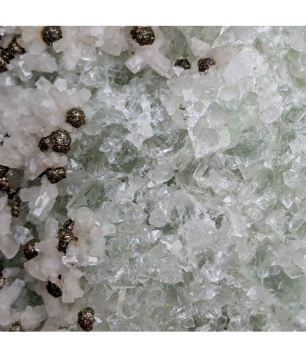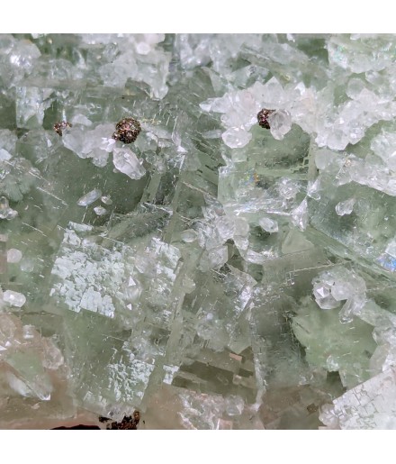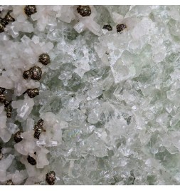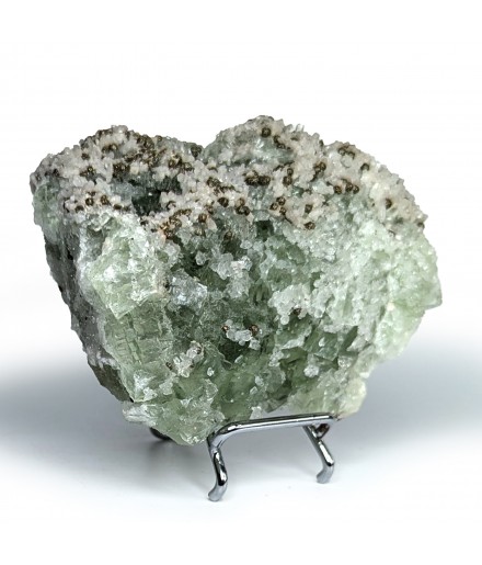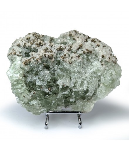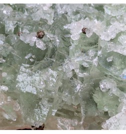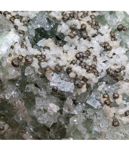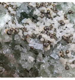 Fluorite apple green partially covered with quartz, hexagonal calcite crystals and spherical chalcopyrite crystals.