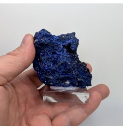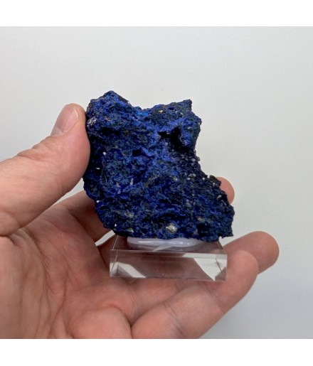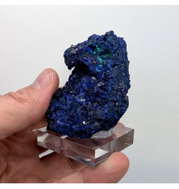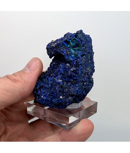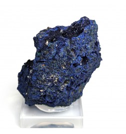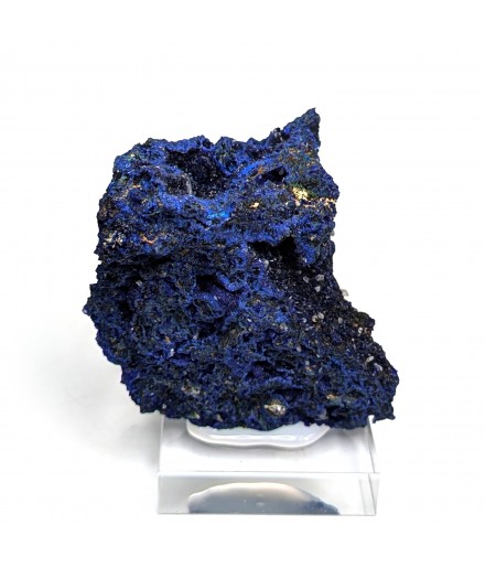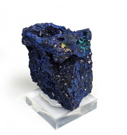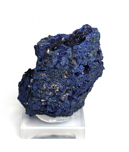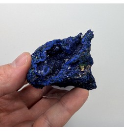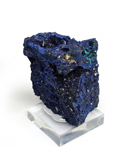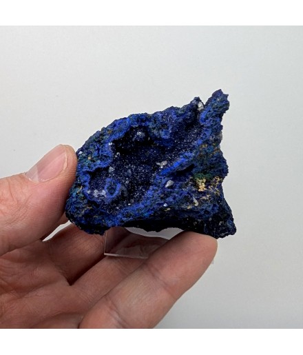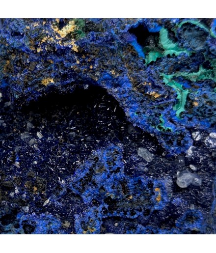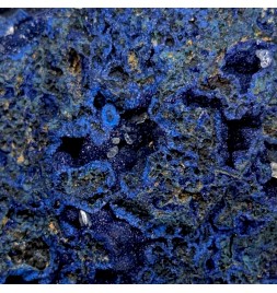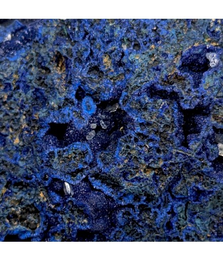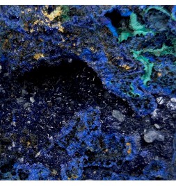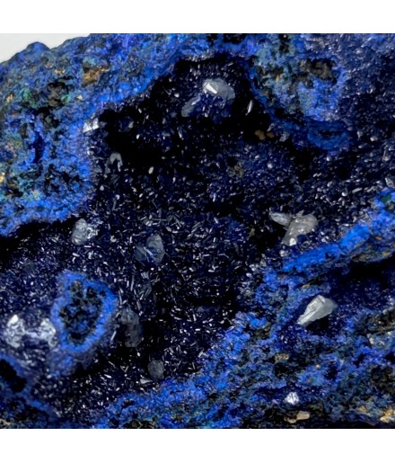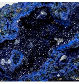 Sample ofazurite dark blue with geode areas containing crystals.