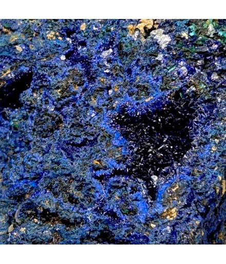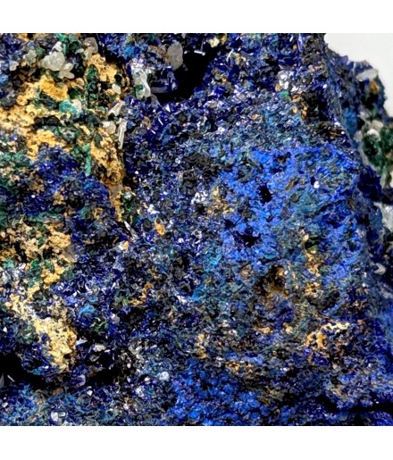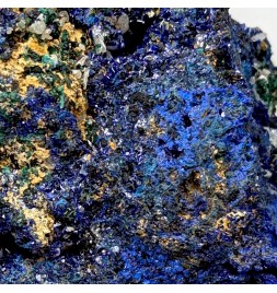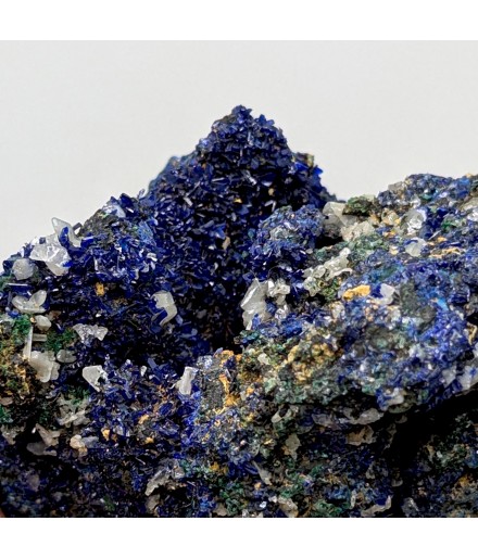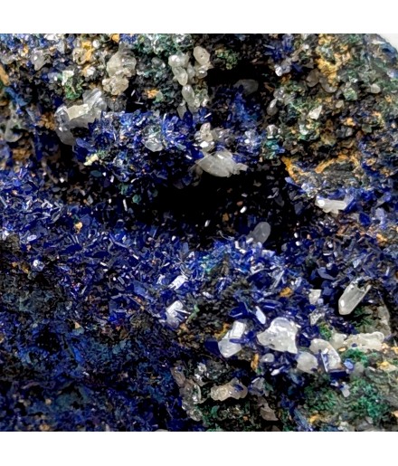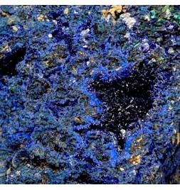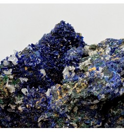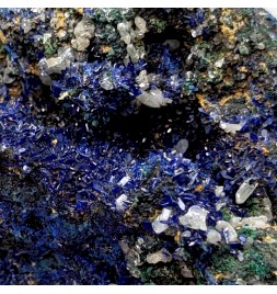 Sample ofazurite dark blue, crystallized in geode areas, associated with cerusite white.