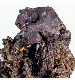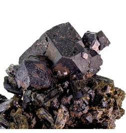 Melanite garnets, the largest measuring 2 cm, resting on a group of epidote crystals.