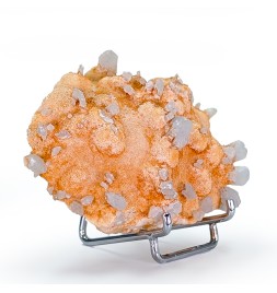 An amazing piece with, on a gangue of calcite stained by oxides, scattered crystals of celestine blue.