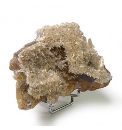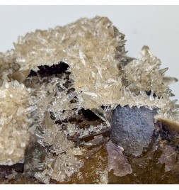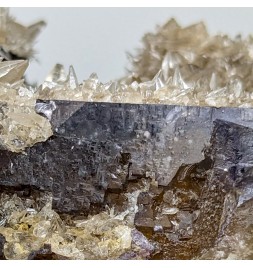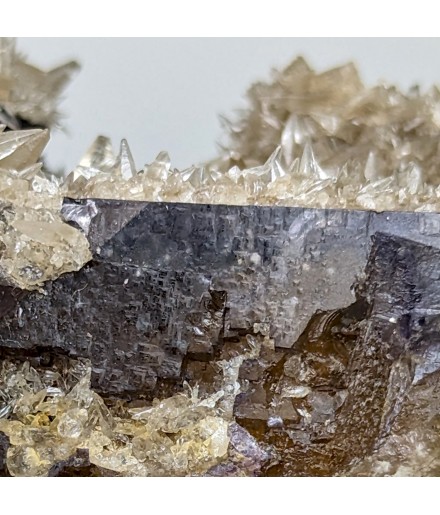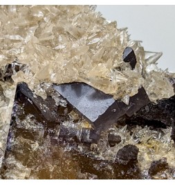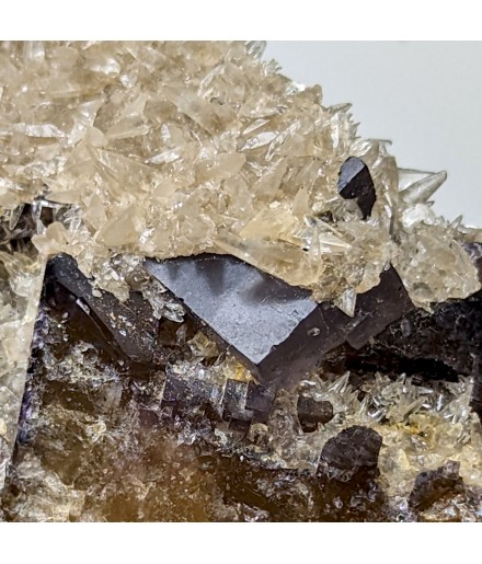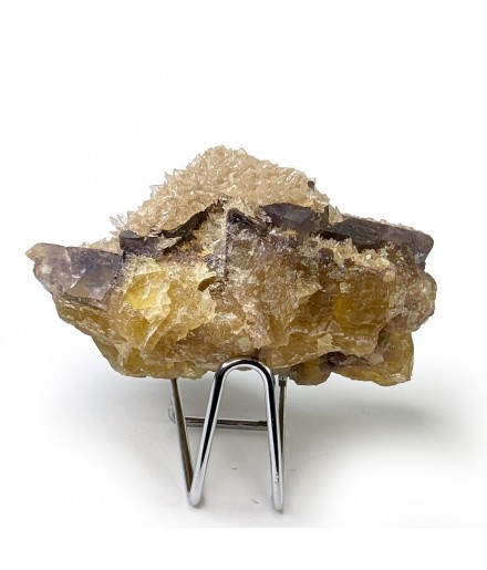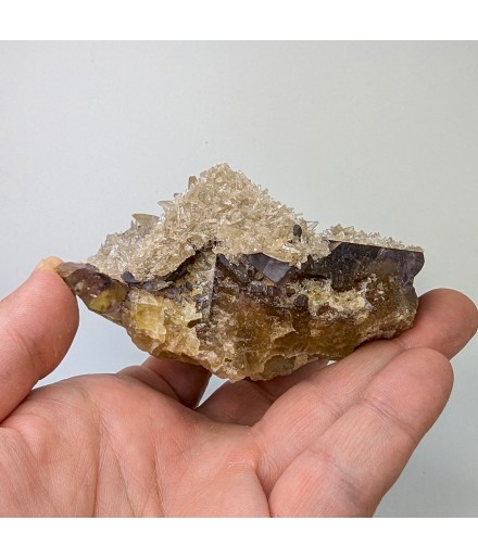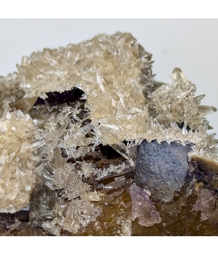 Fluorite yellow at heart and purple on the surface, covered by calcite in dog teeth.