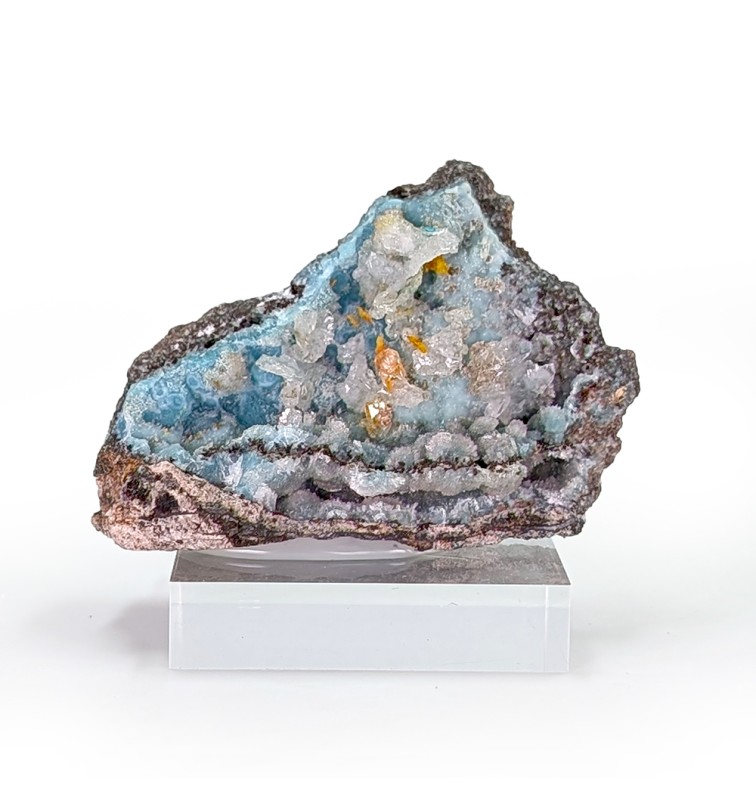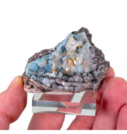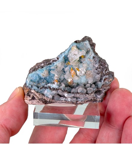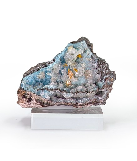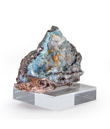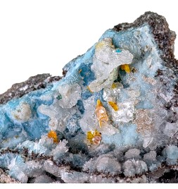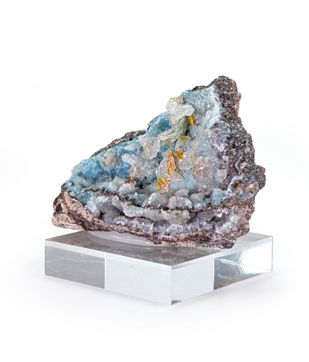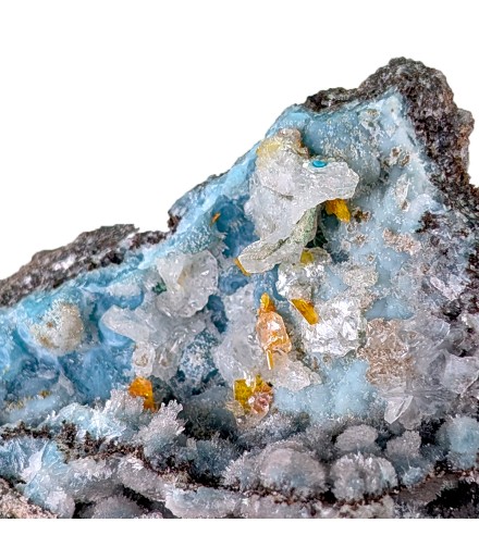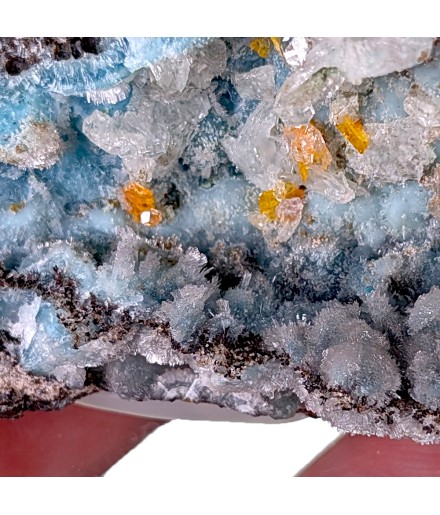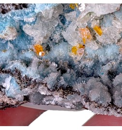 Interesting and rare piece, with crystals of wulfenite yellow andhemimorphite transparent on a carpet of blue botryoidal hemimorphite.