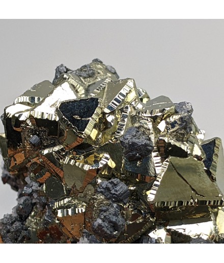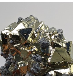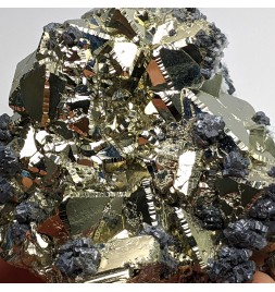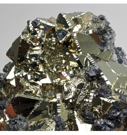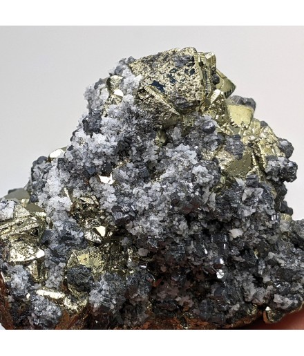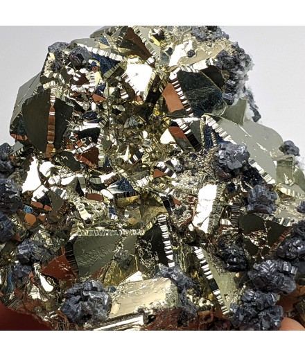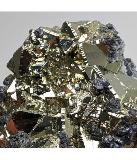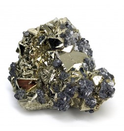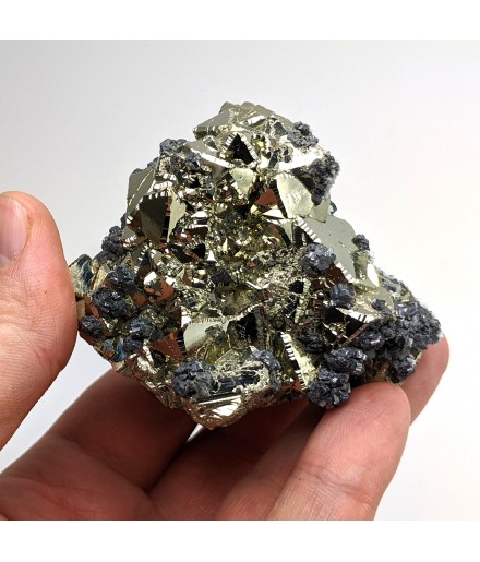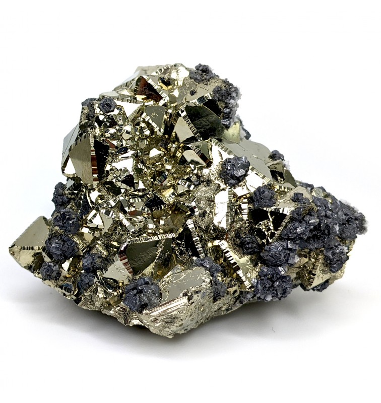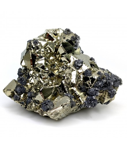 Shiny Pyrite with octahedral crystals, with a partial covering of sphalerite.
