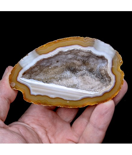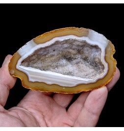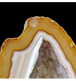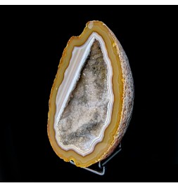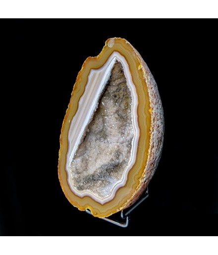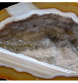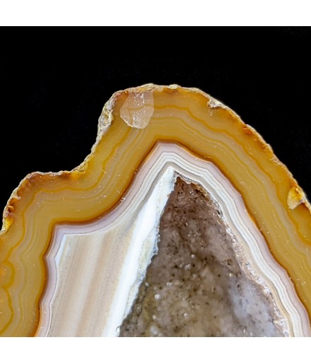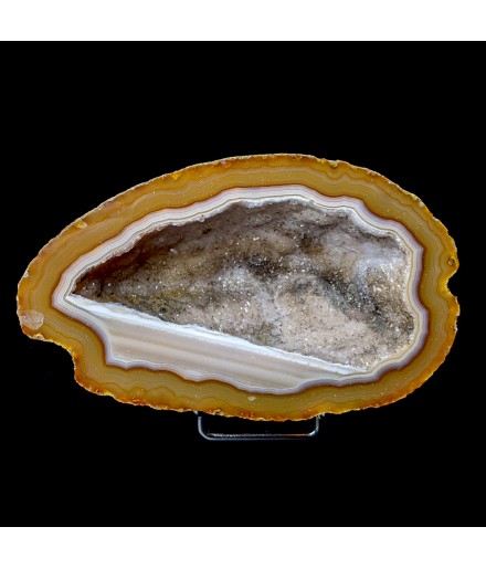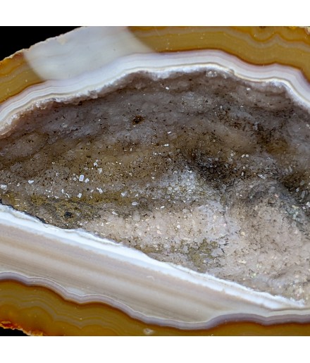 Geode ofagate brown, with a thin light border, going around a cavity filled with a thin shiny layer of quartz.