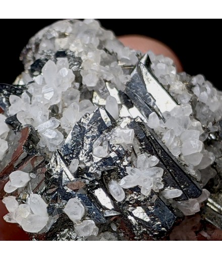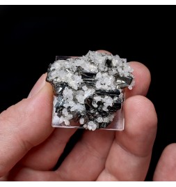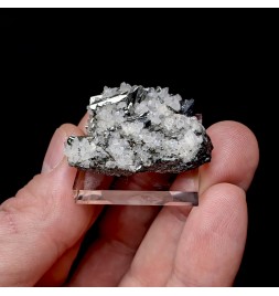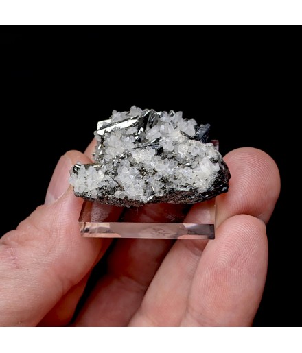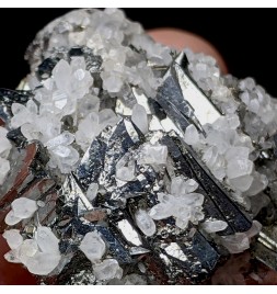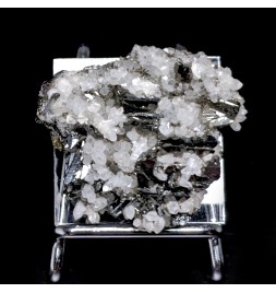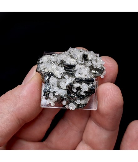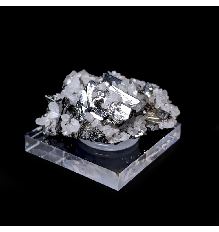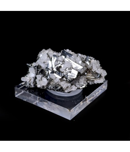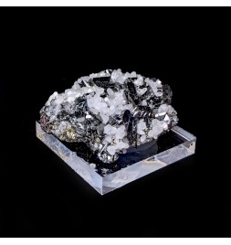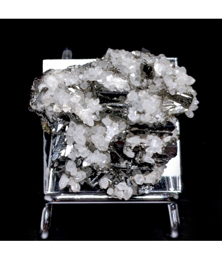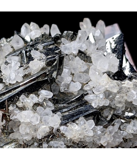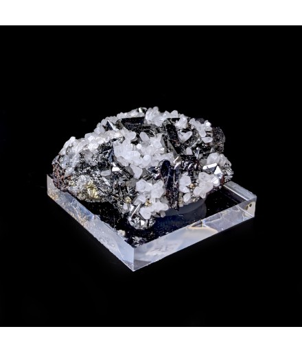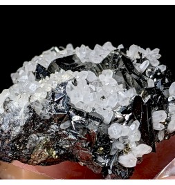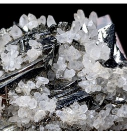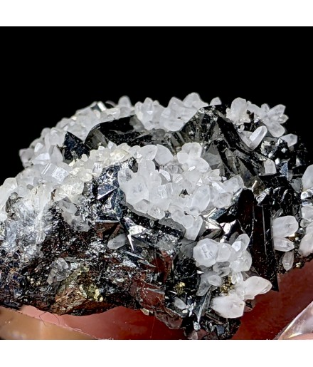 Miniature mounted on a base presenting an association of sharp and shiny crystals of tetrahedrite with quartz crystals.