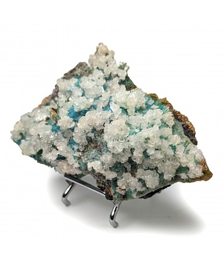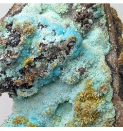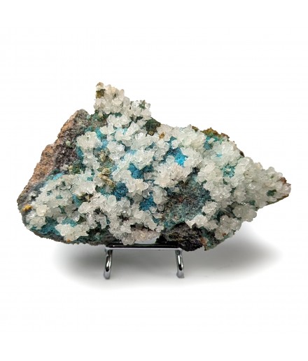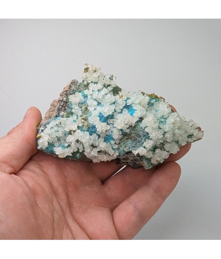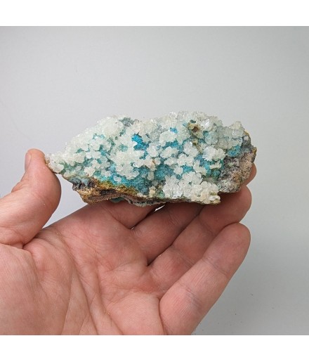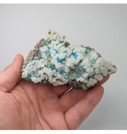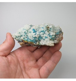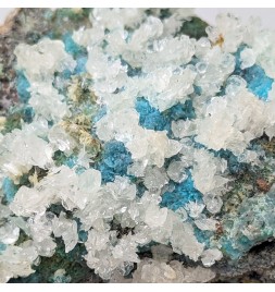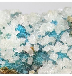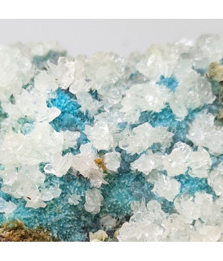 Piece presenting on gangue a carpet of chrysocolla crystallized topped by crystals of gypsum.