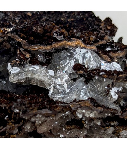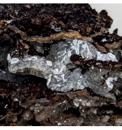 Mineral with a flaky appearance, presenting crystals ofhemimorphite shiny caught in limonite lamellae.