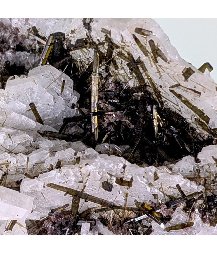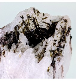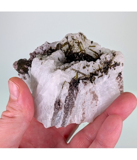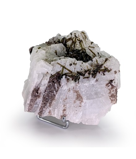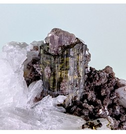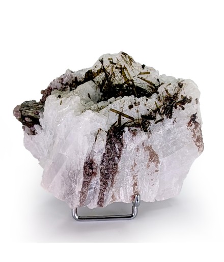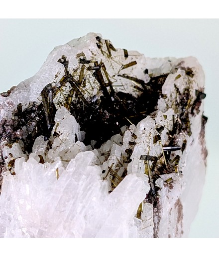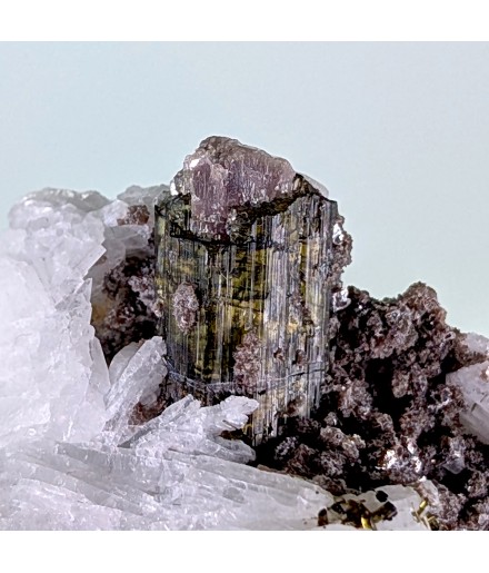 Brazilian sample consisting of crystals of cleavendite white, bearing numerous crystals of tourmaline green and shiny, as well as a thicker tourmaline crystal called "watermelon" (green body and pink heart).