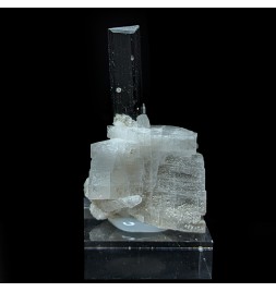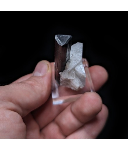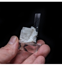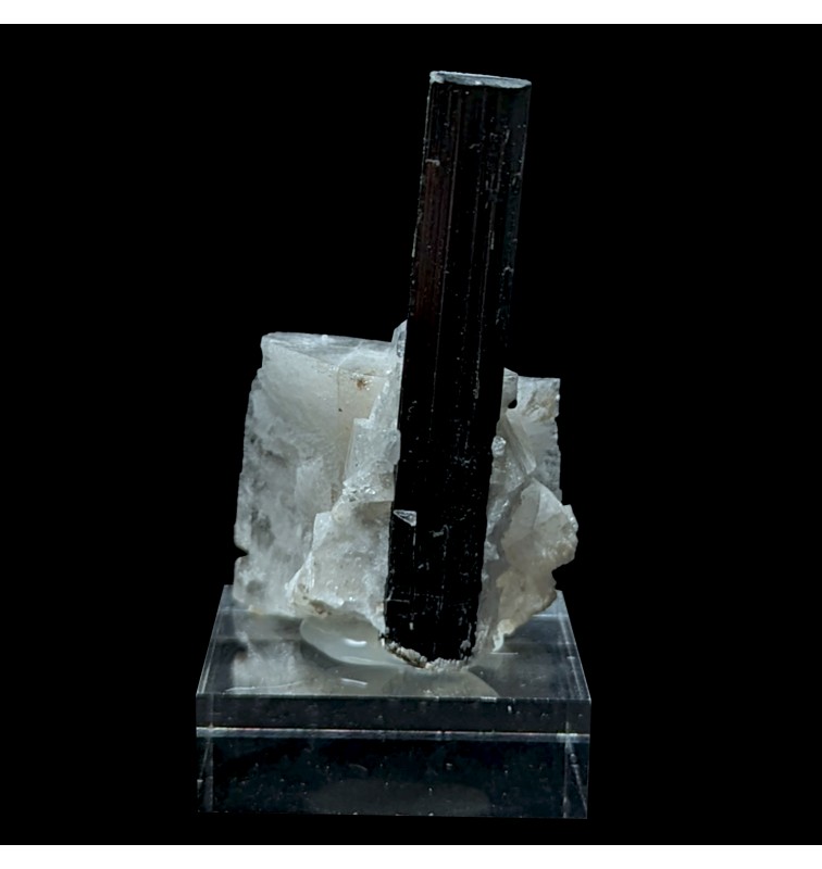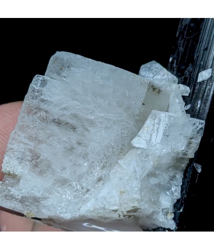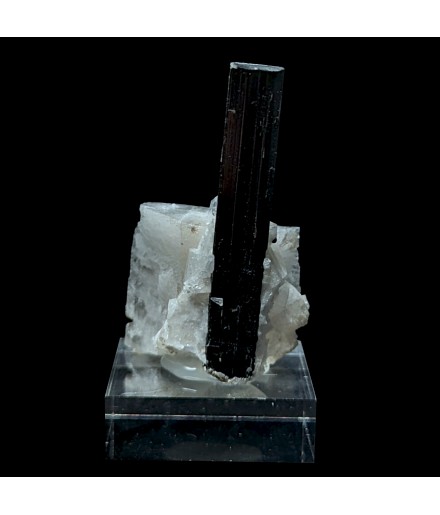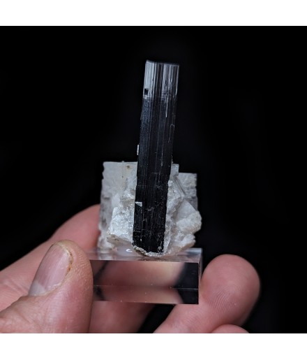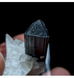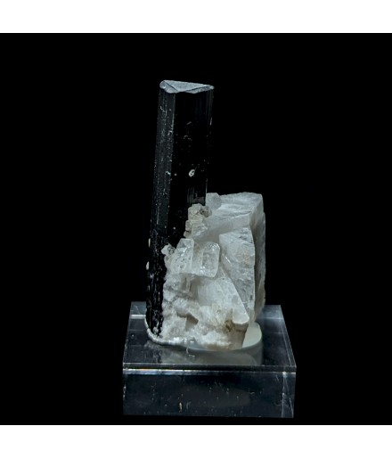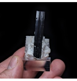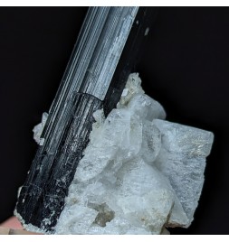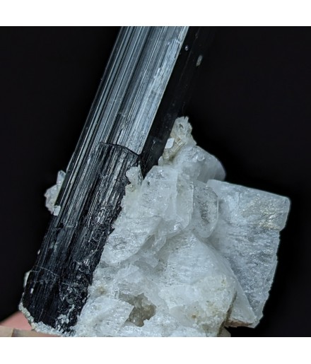 Crystal of tourmaline dark with a green termination (visible only with lighting) embedded in albite.