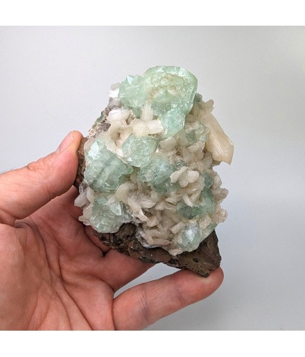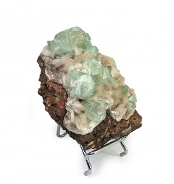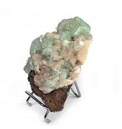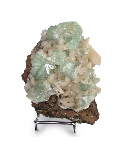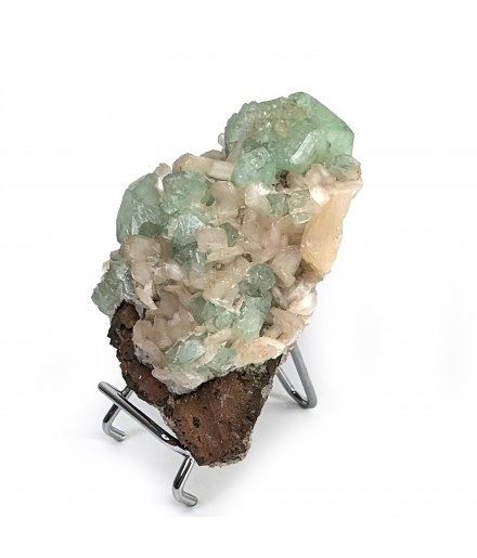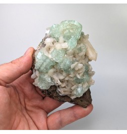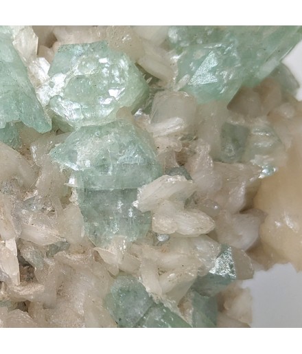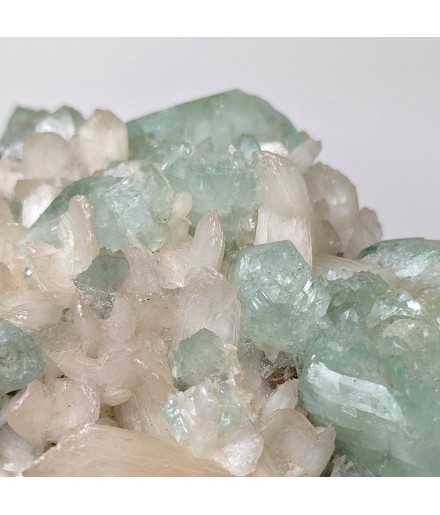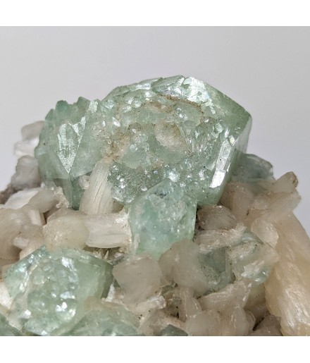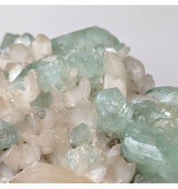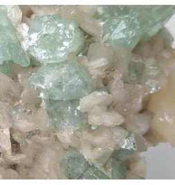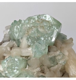 Interesting piece associating stilbite white and crystals ofapophyllite partially crystallized green.