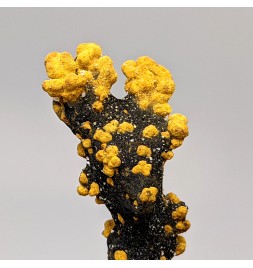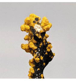 Sample of romanéchite, a black manganese oxide containing barium, covered with a yellow ferric oxide (goethite?).