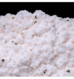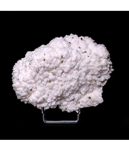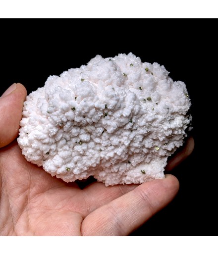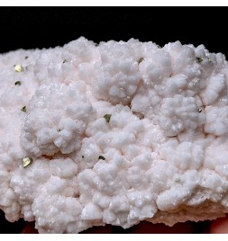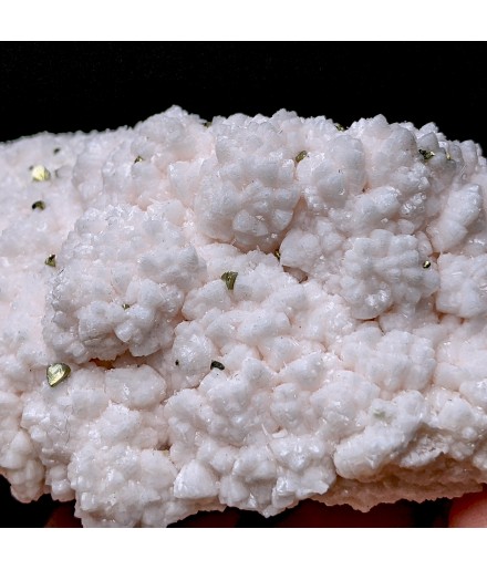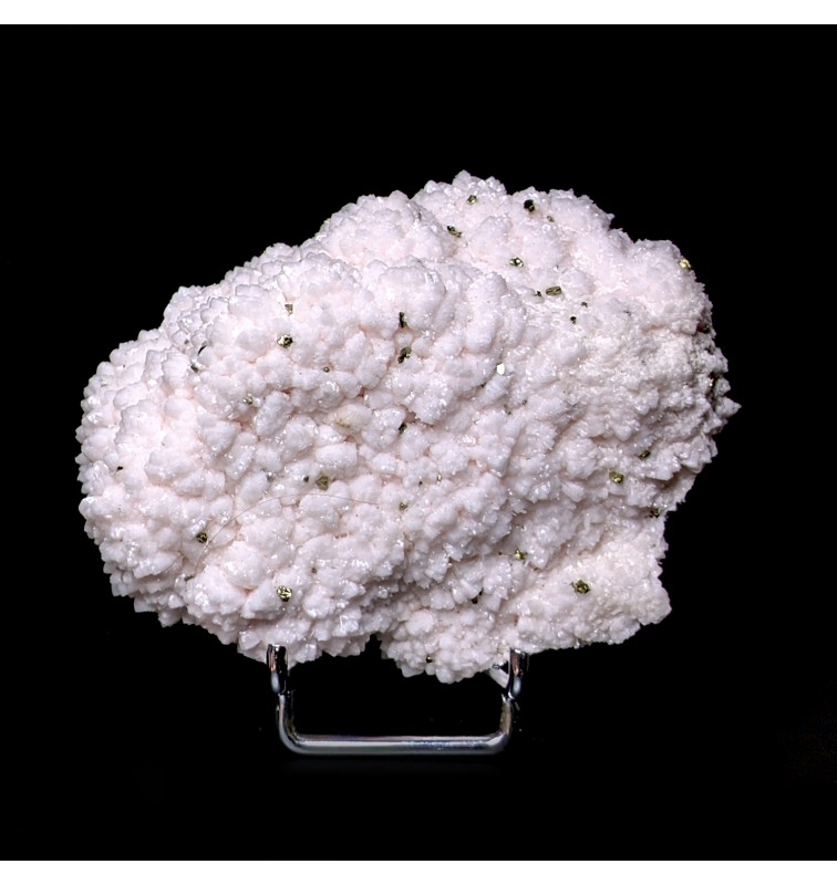 Crystallization of manganocalcite with a light pink and pearly appearance, covered with small pyrite crystals.